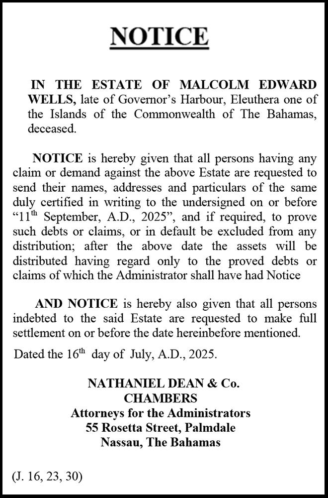 Notice is also hereby given that any person having a claim against the Company is required, within 14 days of the date of this Notice, to send their names, addresses and particulars of their debts or claims to Sterling (Bahamas) Limited, the Liquidator of the Company, or in default thereof they will be excluded from the benefit of any distribution made before such debts or claims are proved.