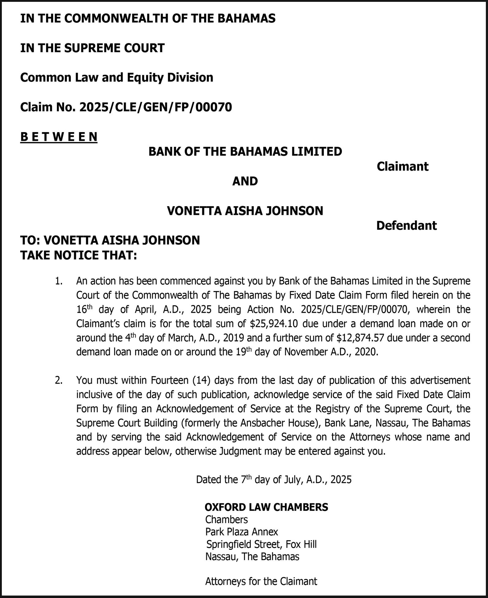 The Public is hereby advised that I,SHERKERA CHRISCINA JOHNSON of Misty Garden off Marshall Road intend to change my name to SHAKERA CHRISCINA CLARKE If there are any objections to this change of name by Deed Poll, you may write such objections to the Chief Passport Officer, P.O.Box N-742, Nassau, Bahamas no later than thirty (30) days after the date of publication of this notice.