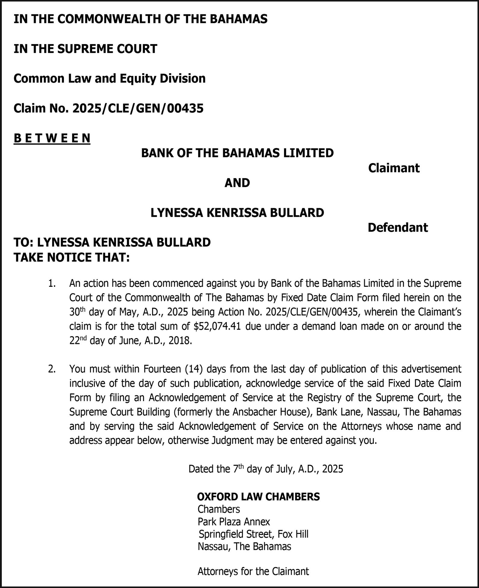citizen of The Bahamas, and that any person who knows any reason why registration/ naturalization should not be granted, should send a written and signed statement of the facts within twenty-eight days from the 9th day of July 2025 to the Minister responsible for nationality and Citizenship, P.O. Box N-7147, Nassau, New Providence, The Bahamas.