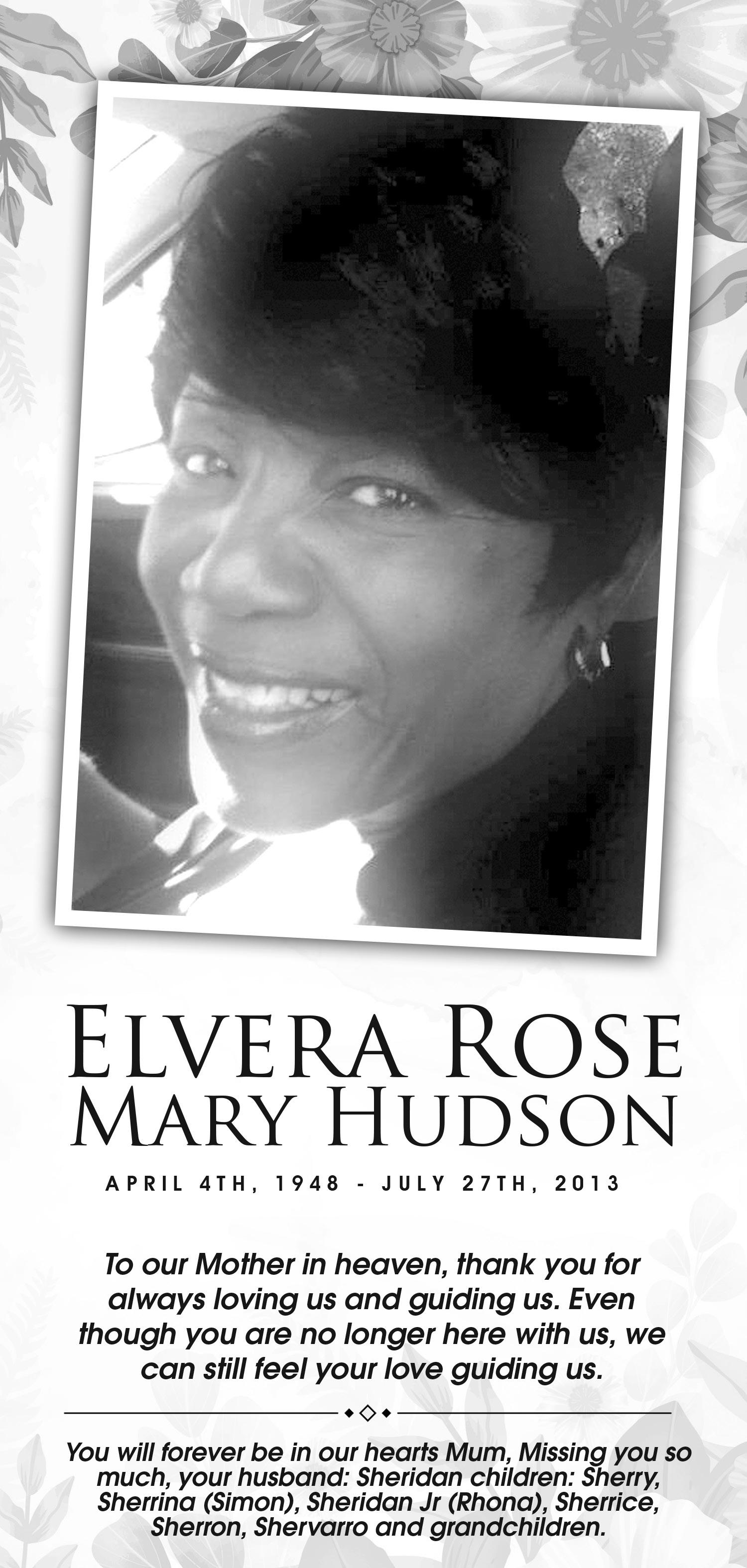 She is survived by her children: Vernita, Stephanie, Edward and Emerika; adopted daughter: Anita; sisters: Maud, Shirley and Nancy; grandchildren: Darren, Giles, Gaileyn, Gabrielle, Abigail, Daniel, Sage and Tobias; great grandchildren: Khaled and Kailen; numerous nieces and nephews and a host of other relatives and friends too numerous to mention.