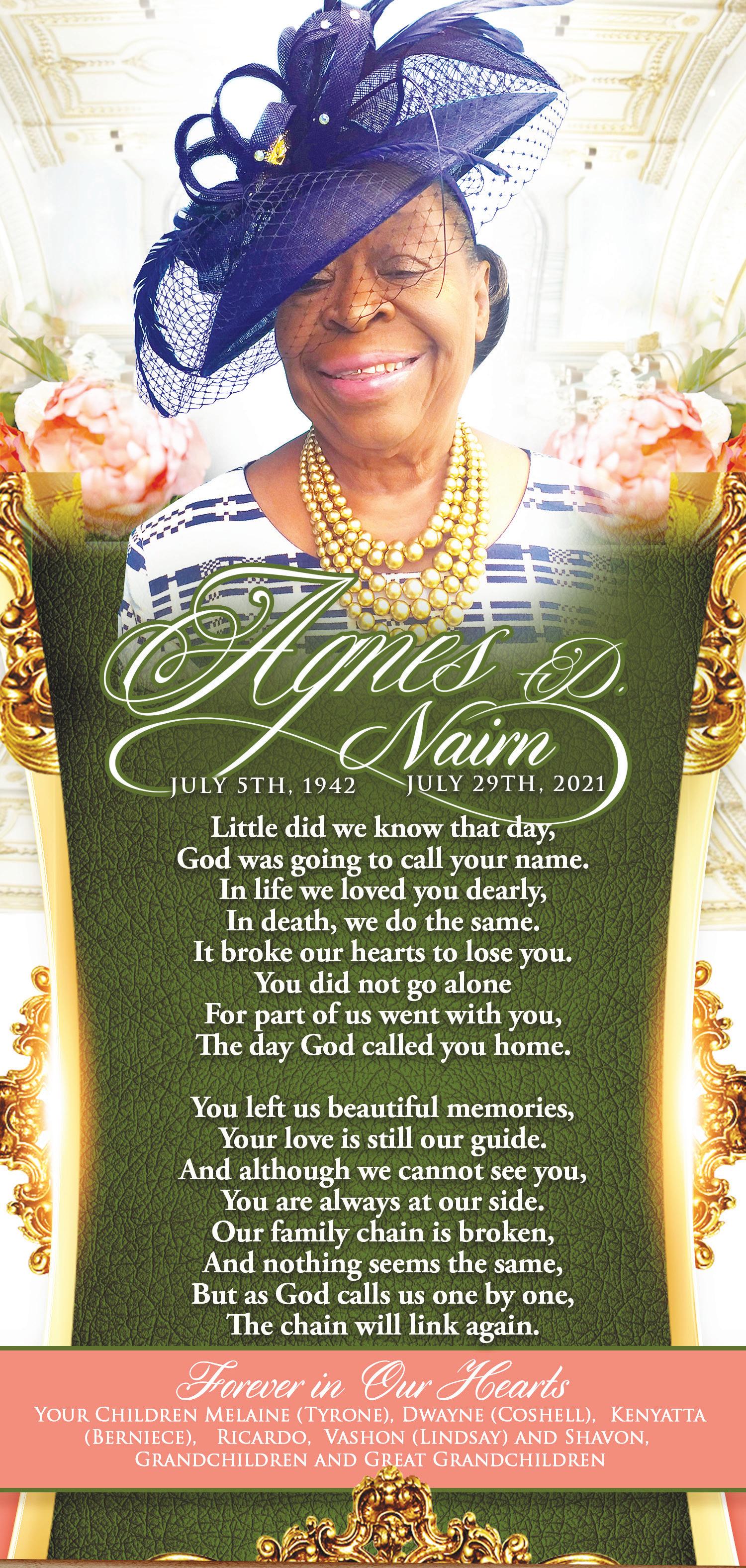 Relatives and Friends may pay their last respects at Butlers’ Funeral Homes & Crematorium, Ernest and York Streets on Friday, July 28, 2023 from 10:30 a.m. to 12:30 p.m. and 1:30 p.m. to 4:00 p.m. and at the church on Saturday, July 29, 2023 from 10:00 a.m. until service time.