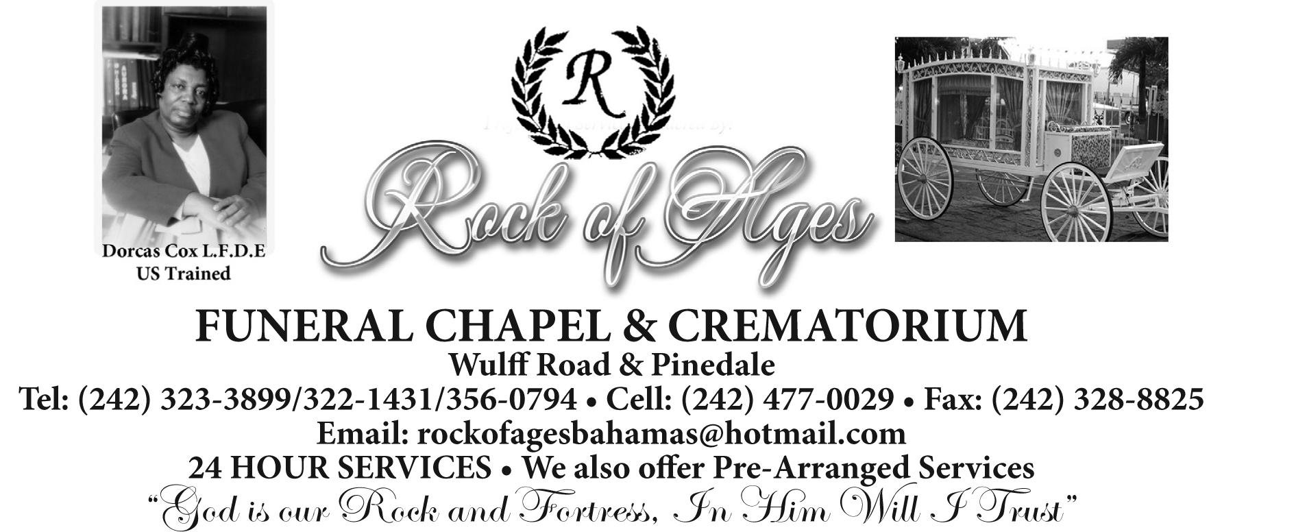 of Hutchinson Street will be held at The Rock of Ages Funeral Chapel, The Jasper Suite, Wulff Road and Pinedale on Saturda, August 19th, 2023 at 12:00 noon. Officiating Rev. Dr. Sabrina Pinder assisted by other Ministers of the Gospel. Cremation will follow.