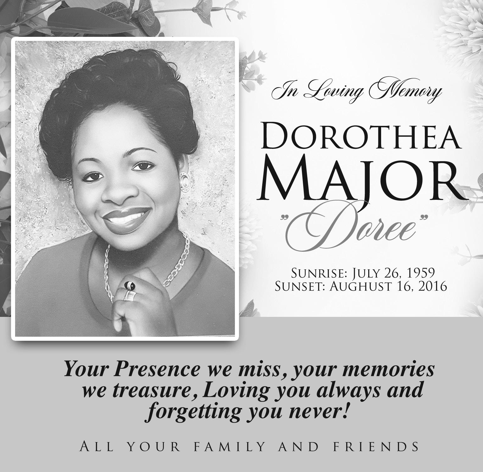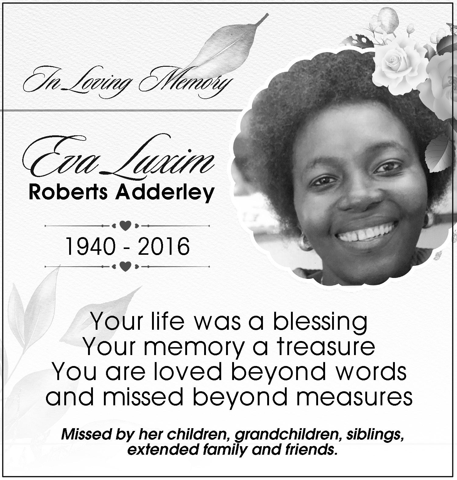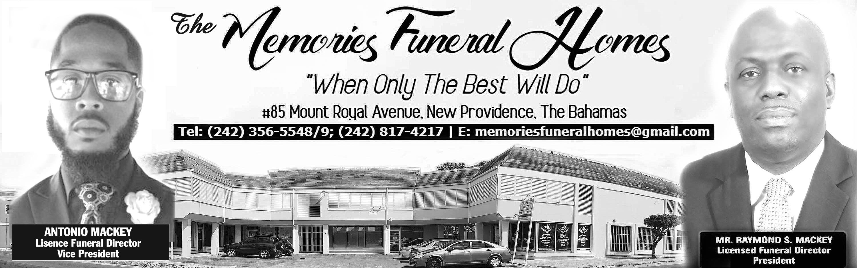 Cherished memories will forever linger in the hearts of her sisters: Miriam and Agnes Brown; brother: David Brown; adopted daughter: Lisa Francis; nieces: Karen Johnson-Brown, Renea and Gladys Brown; nephews: Thaddeus (Marilyn) Wright, Nathan (Amanda) Mackey, Insp. Harrison (Jennifer) Brown, Dwight (Joy) Brown, David Jr., (Debbie) Brown, Kingman (Melinda) Brown, Herbert Brown; grand nieces: Denise, Bernise and Keisha Wright, Natavia Mackey, Johnell Thompson, Alissa and Arrianna Wilson; grand nephews: Bonnet and Owen Wright, Lavardo and George Deveaux Delmaro, Nathan Jr., and NaShad Mackey, An’vaar Wilson, Harrison Jr., Herbert Jr., III; relatives and friends including: Reverend Dr. T. G. Morrison and the family of Zion Baptist Church, East & Shirley Streets, Reverend Harrison (Rhoda) King, Moderator for the Cat Island District Reverend Christopher (Deaconess Olive King); numerous cousins: Mrs. Rosi Major and family, Mrs. Maize Simmons and family, Mr. Sham (Carolyn) Burrows, Mrs. Teserene Gray, Verdell Mackey, Mrs. Mavis Miller, Syblean Mackey, Roosevelt and Salathiel Mackey Jr., Rev. Benjamin Gibson, Suffragan Bishop Christopher Minnis and Elder Melanie Minnis, Eulean Dawkins, Mrs. Olive Rolle and the entire Dawkins Family, Pearline Johnson, the children of Ishmael & Albetha Smith, Charlotte Culmer and Family, May Mackey and Family, Octavius (Pastor) Joann Mackey and family, Sharon Farrington and family, Alice and Wendell Devaux , jesting and Amos Burrows,Cynthia,Paulette, Eva, Linda and David Mackey Barbra Thompson, Felix and Mary Bodie, Helena Morley, Jackson Augustav, Peaches and Alexander Mackey, Herbert Mackey, the descendants of Burke and Clauhetta Clarke, Hester Gray, Inez Rolle and family, the Culmer’s, Delancy, Gibson, Deborah Edgecombe and Nathaniel Gilbert Gilbert, Ramsey, Rolle and Smith Families and the entire settlement of Devil’s Point and McQueen’s including Pastor Kermit (Lisa) Rolle and family Mrs. Rosabell Rolle, Deacon Wayde (Deborah) Green and family, Paula Romer & Family, The Right Hon. Philip Brave Davis, Prime Minister and Member of Parliament for Cat Island., Mr. Anthony (Mavis) Rolle, Alexander Mackey, Evangelist Levinna Rolle and the members of the soup kitchen New Bethlehem Baptist Church and the John Road Community.
