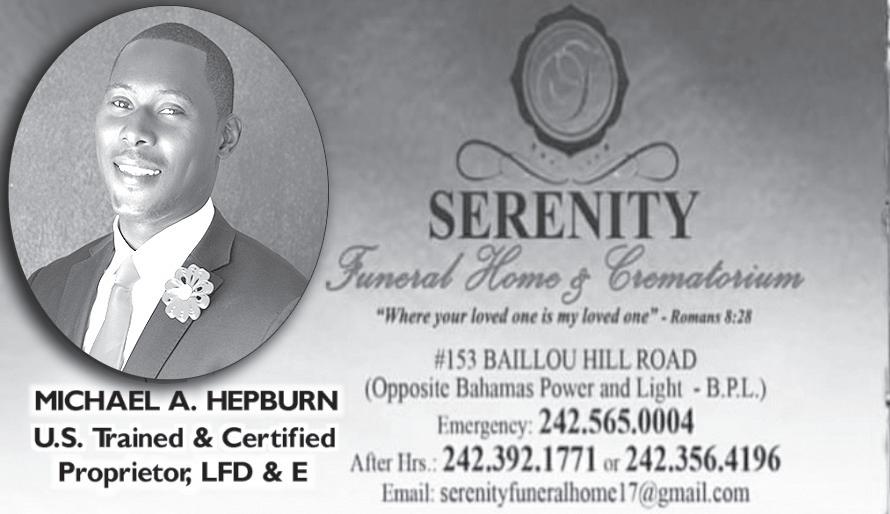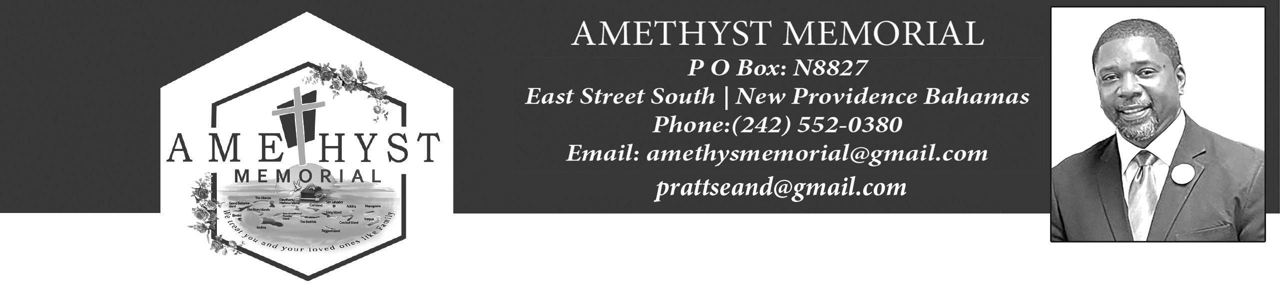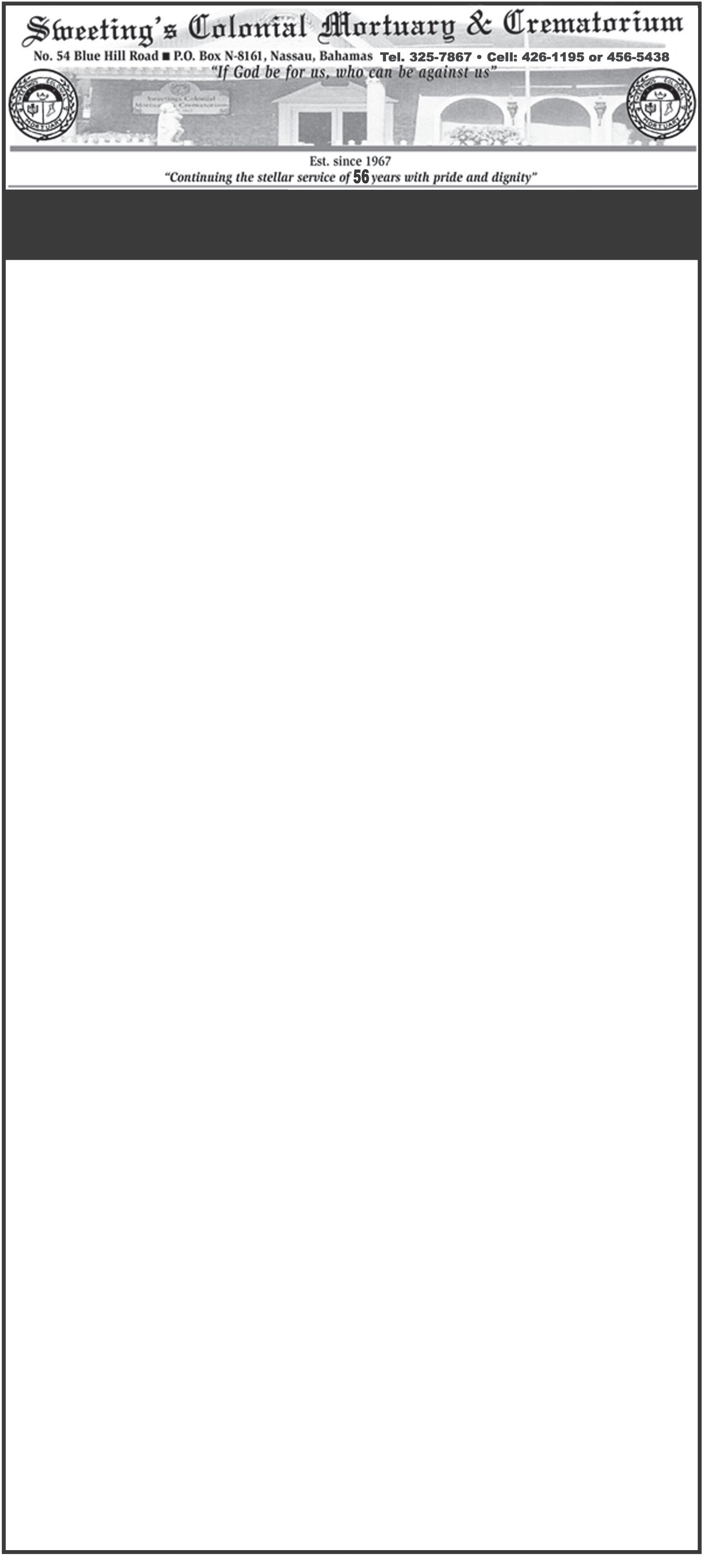 Left to celebrate her life and cherish her memories are her sons: Khawan and Jason Claridge; grandchildren: Te’Quan Dean, Jadad and Ja’naire Claridge; daughter-in-law: Tranika Garvey; sisterin-law: Deborah Claridge; sisters: Brenda and Machelle Carroll, Barbara (Fredrick) Foster and Mary Dean; brother: Alfred Carroll; nieces: Candice Foster, Chelsea (Christopher) Bastian, Shanequa (Alexis) Thompson, Celestial Carroll, Shantera (Darren) Prosper, Ordia (Jason) Rolle and Saraan Gibson; nephews: Stephen V. Isaacs, Cameron Foster, Bashon, Tahaje and Calvin Dean, Anthon and Brendon (Courtney) Carroll; grand nieces: Camiyah Foster, Bri’niyah, Brielle and Bliss Carroll, Journee Scott, Cherprei and Chozen Rolle; grand nephews: Darren, Takwan and Darajh Prosper, Jayden and Tachii Rolle, Leander Bethel, Caiden Foster and Aldon Thompson; special friend: Elizabeth Roberts; numerous cousins and other relatives; special thanks to: her long time Doctor-Dr. Braynner, and the many Doctors and Nurses of the Elizabeth Estates Clinic and The Princess Margaret Hospital.
