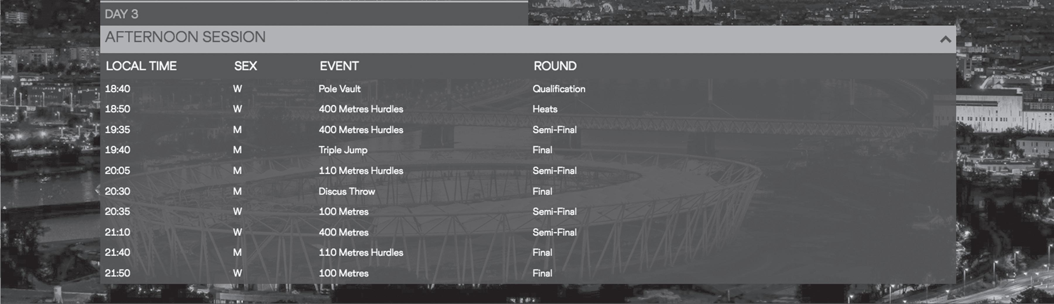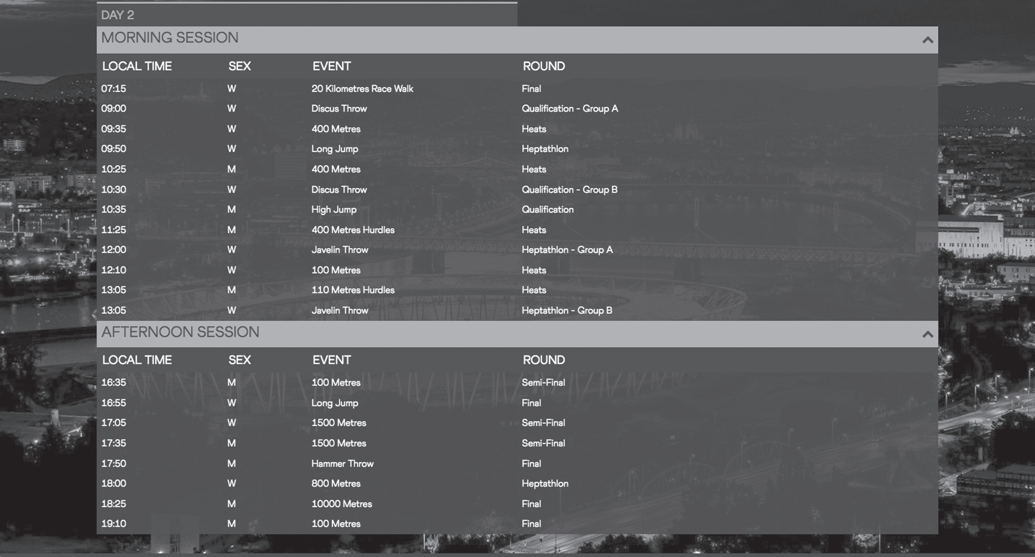 DAY FIVEWednesday, August 23 Morning Session 10:20am - Women’s javelin qualifying. Group A - Rhema Otabor