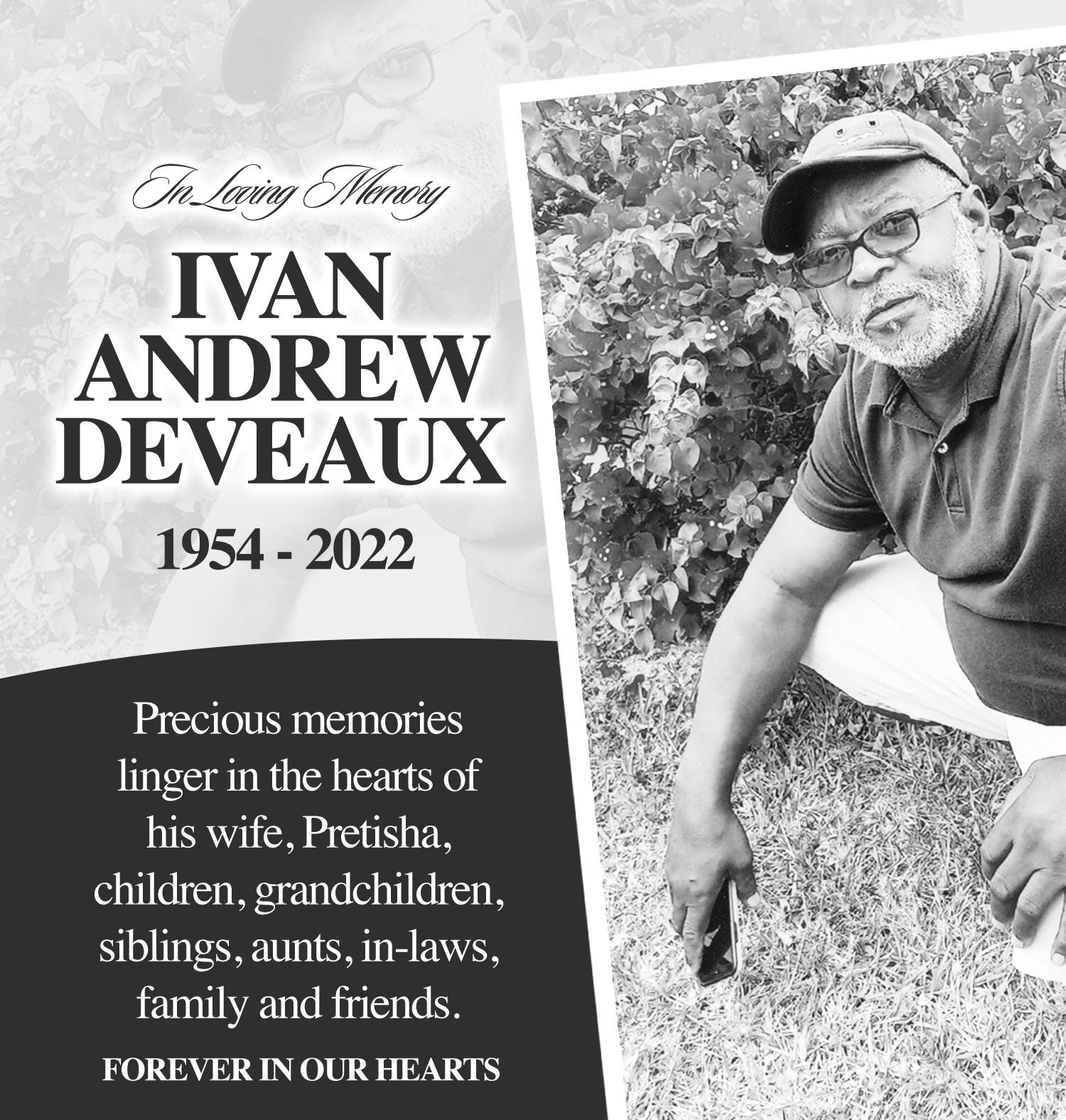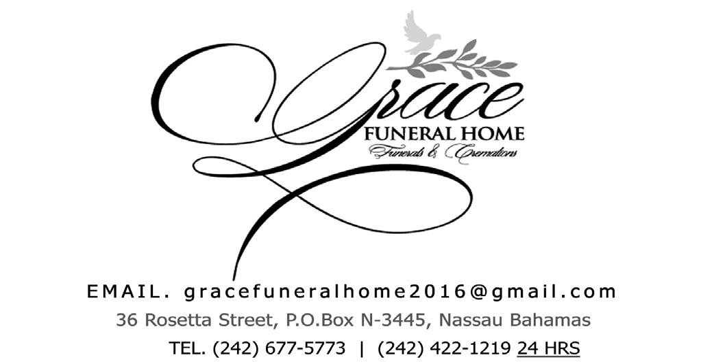 Left to cherish the memory of John “Dee” Bethel are His loving, devoted, loyal and committed wife of 52 years: Mrs. Ruth Naomi Bethel (née Farrington); Sons: John Bethel Jr. of Houston, TX, and Retired Sgt. 173 Lawrence Bethel; Daughters: Shelease BethelValentine and Letitia Bethel-White of Atlanta, GA; Sons-in-Law: Derek Valentine and Donald T. White Jr. of Atlanta, GA; Daughters-in-Law: Dedra Bethel of Houston, TX and Lori Bethel; Adopted Son: Retired Sgt. 746 Jenkin Gibson; Adopted Daughters: Mrs. Terry Ferguson (Perry) and Mrs. Shavette Gibson (Francis); Grandchildren: Shnik (Ed) Thompson, Lauranique, Lawrence Jr., Laron, Lauren, Latrell, Laron, John III, and Joann Bethel, Lachelle Bethell, Lashawn (Clement) Rolle, Italia Bethell, Warren Bethell Jr., Caleb and Ayden White, Francis Jr., Franiecia, Tonajae, Tonajah, and Frantasia Gibson, Shervin, Janeisha, Janee, Jenkin Jr., Jalileel and Jayden Gibson; Great Grandchildren: Travis Smith Jr., Lawrence Bethel III, and Armani Grant; Brother: Patrick Bethel; Sisters: Cynthia Rahming, Joyann Johnson, Deborah Bethel, and Linda Adderley; Brothers-in-Law: Joseph Major Willard Stubbs Sr., Leroy Johnson, Anthony Adderley Sr., and Rev. Richard Thurston, Kevin Farrington, Mark Farrington, Rodney Flowers; Sistersin-Law: Arlene Flowers and Stephanie Major; Nephews: Bradley (Cheryl), Mario (Vanessa) and Willard Jr., James Jr. (Regina) of New York, Jason (Danielle), Jeremy Rahming, Darren, Phillip Bethell Jr., Anthony Adderley Jr., Paul Thurston, Robert Jr. (Delores), Ryan (Laverne), Egan and Duran Bethell, Edmund Lewis (Janice), Rodney, Orlando and Ryan Flowers, Andrew Ferguson, Adrian McPhee (Kiki), Alex Major, Julian Williams and Kevin Farrington Jr., Steven Farrington, Michael, Trevor and Troy Laing, and Terrell Rolle; Nieces: Nathanria (Antonio) Williams, Judith Rahming of Houston, TX, Jillian (George) Pinder, Audra Bethell, Simone (Paul) Longley, Kristy Johnson, Phillippa Bethell, Lakeisha (Insworth) Wilson, Kaliah Sutherland, Cicely (Jared) Whyms of Canada, Deborah (Wendal) Carey, Velda (Perry) Clarke, Mercia (Kirkwood) Deal, Faith (Jermaine) McKenzie, Natasha (Washington) Gordon, Shamica (Omar) Wedderburn, Abigail Williams, and Dorcas Thurston, Mary Flowers, Yvette Sturrup (Leon)