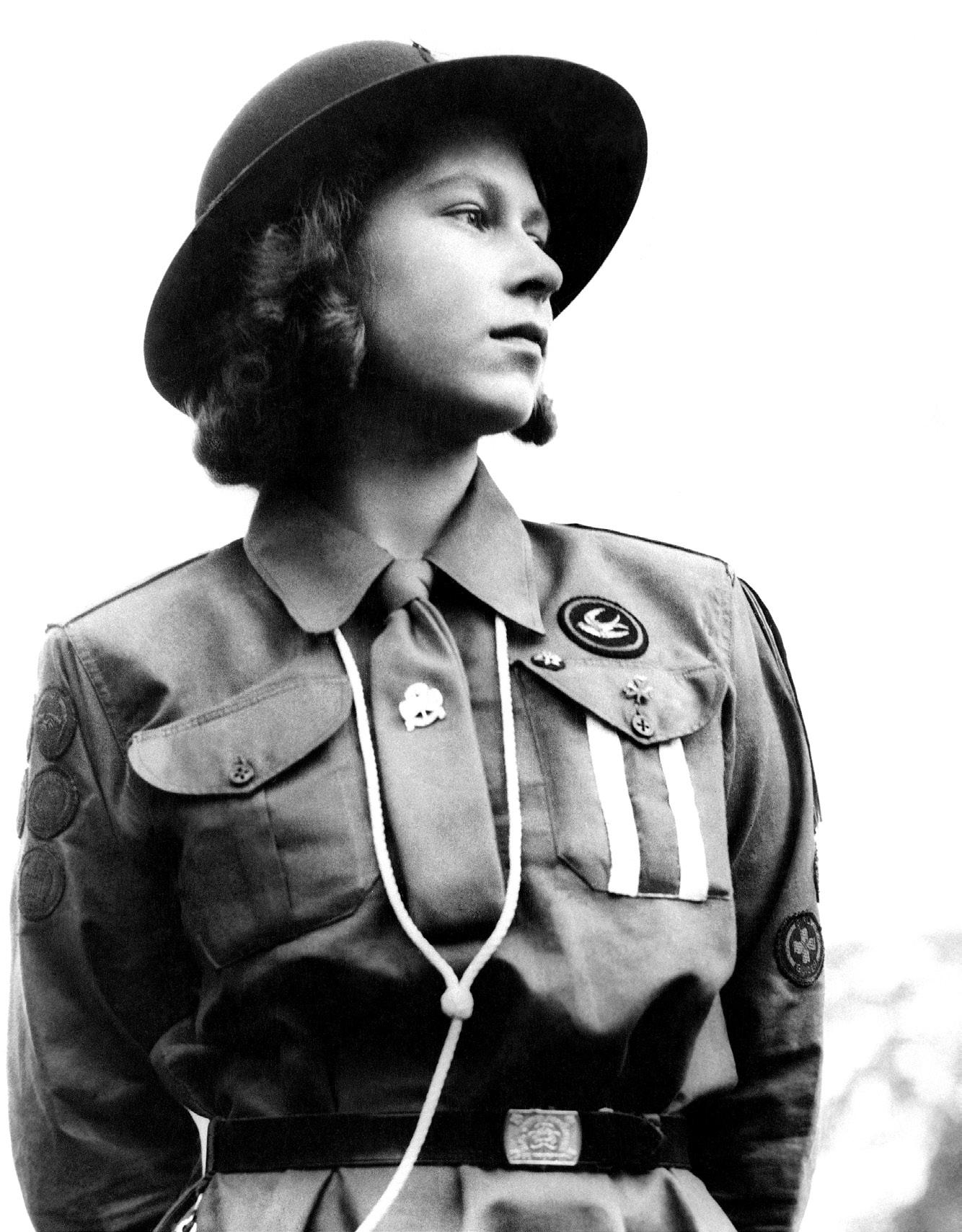 Princess Elizabeth poses for a photo in a Girl Guides uniform, in Windsor Great Park, England.