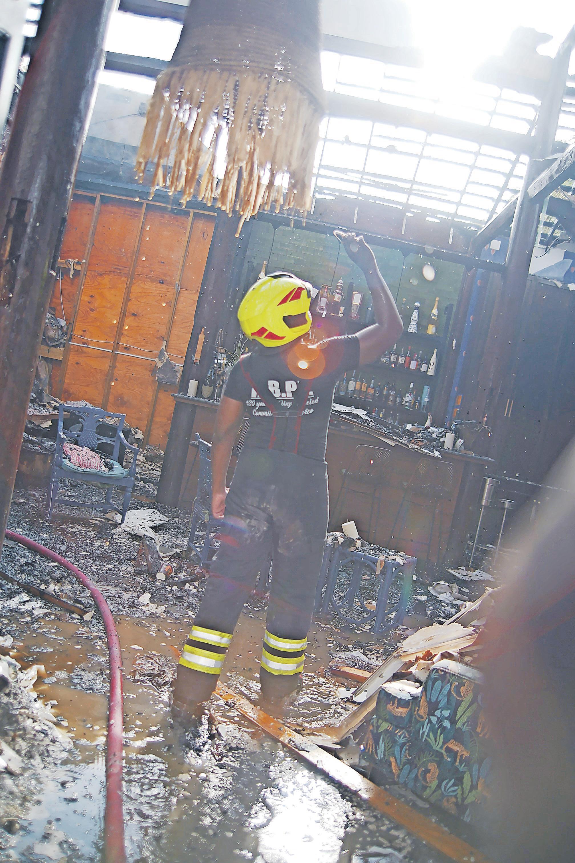 carrying out work when the incident occurred. The fire also caused roof damage to two other businesses in the Harbour Green Shopping Plaza on West Bay Street before