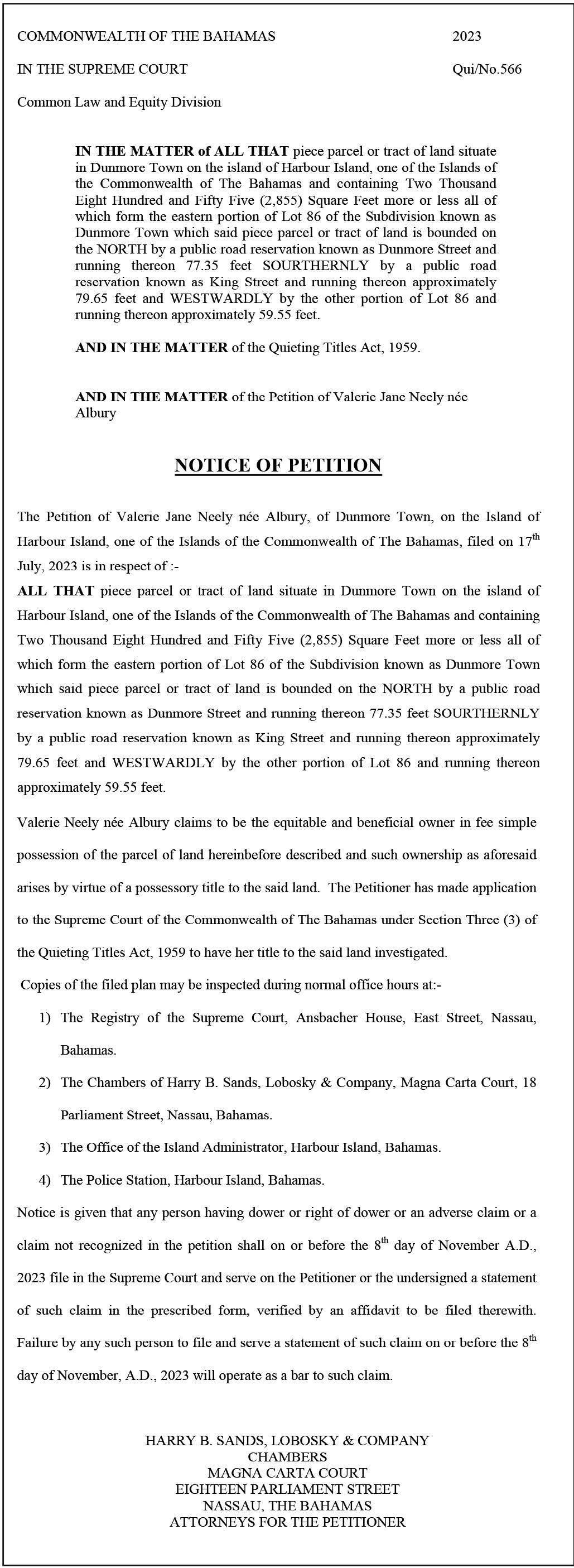 Attorneys for the Executor 1100 East Bay Street Marsh Harbour, Abaco Bahamas