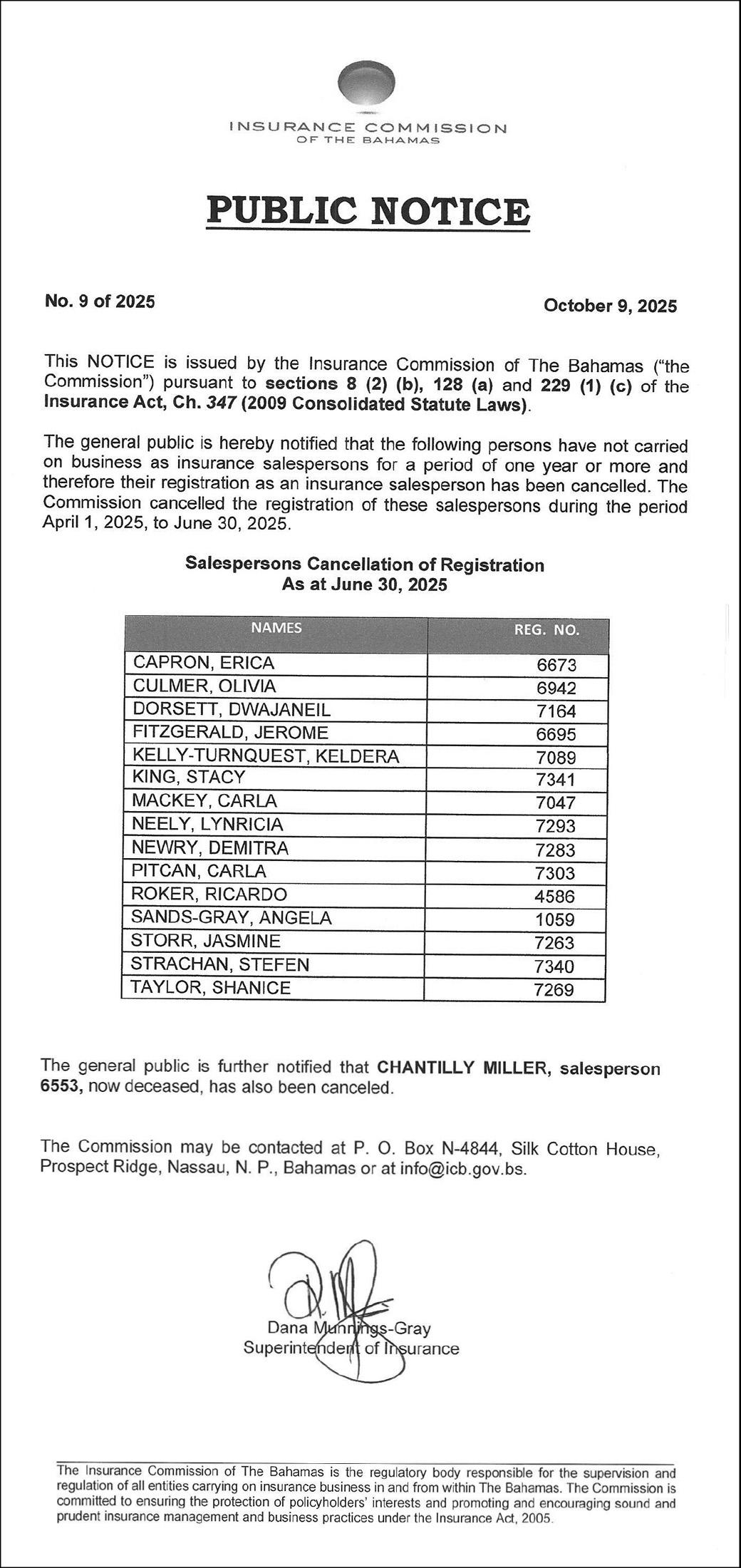 NOTICE is hereby given that SHANICA MELICE of Pinedale, Nassau, The Bahamas is applying to the Minister responsible for Nationality and Citizenship, for Registration/Naturalization as a citizen of The Bahamas, and that any person who knows any reason why shouldregistration/naturalization not be granted, should send a written and signed statement of the facts within twenty-eight days from the 9th day of October 2025 to the Minister responsible for nationality and Citizenship, P.O. Box N-7147, Nassau, New Providence, Bahamas.