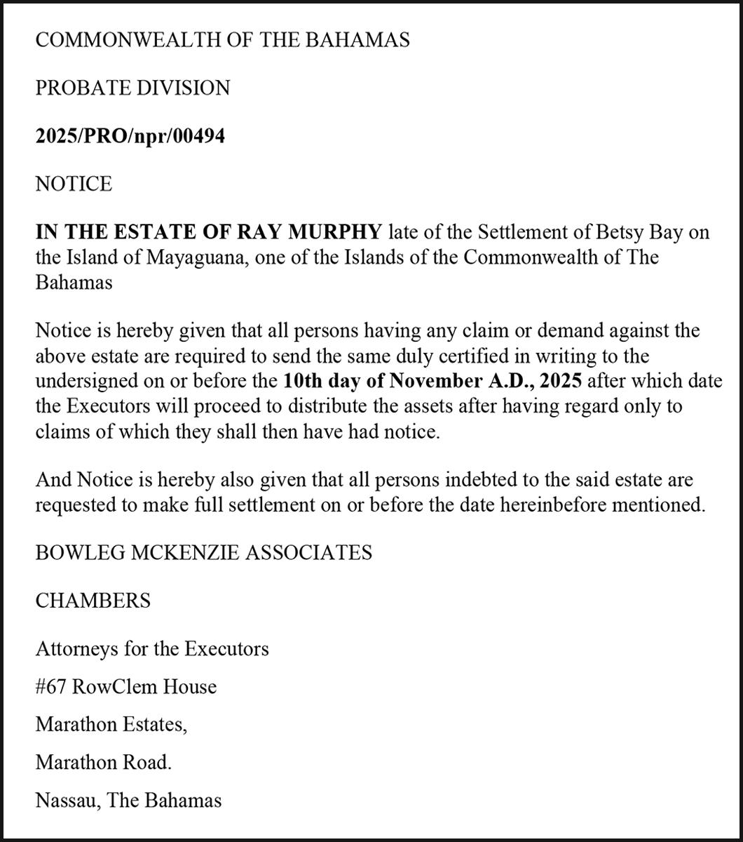 NOTICE is hereby given that KENNETH OKHUAROBO of Carmichael Road, Nassau, The Bahamas is applying to the Minister responsible for Nationality and Citizenship, for Registration/Naturalization as a citizen of The Bahamas, and that any person who knows any reason why registration/naturalization should not be granted, should send a written and signed statement of the facts within twenty-eight days from the 9th day of October 2025 to the Minister responsible for nationality and Citizenship, P.O. Box N-7147, Nassau, New Providence, Bahamas.