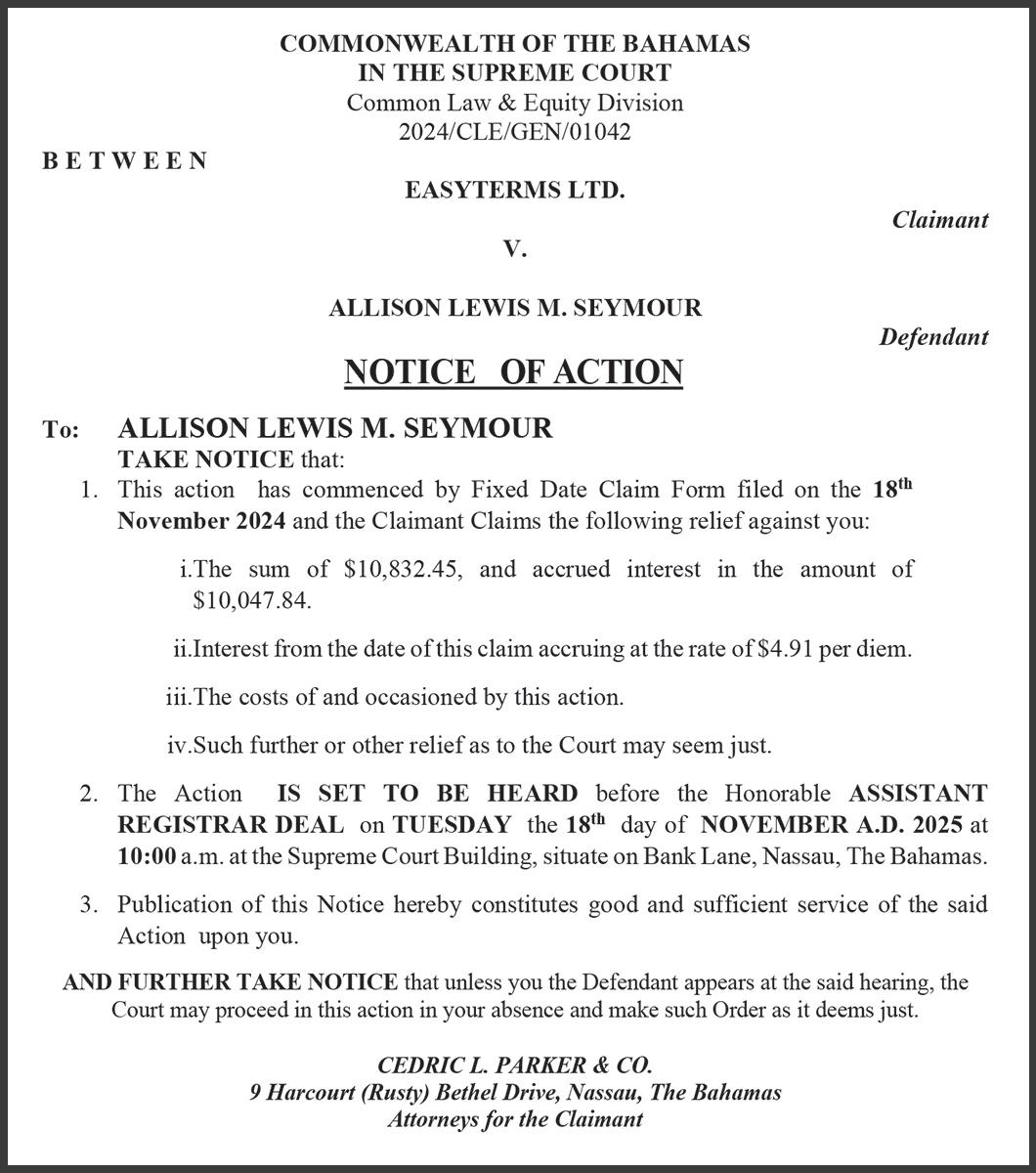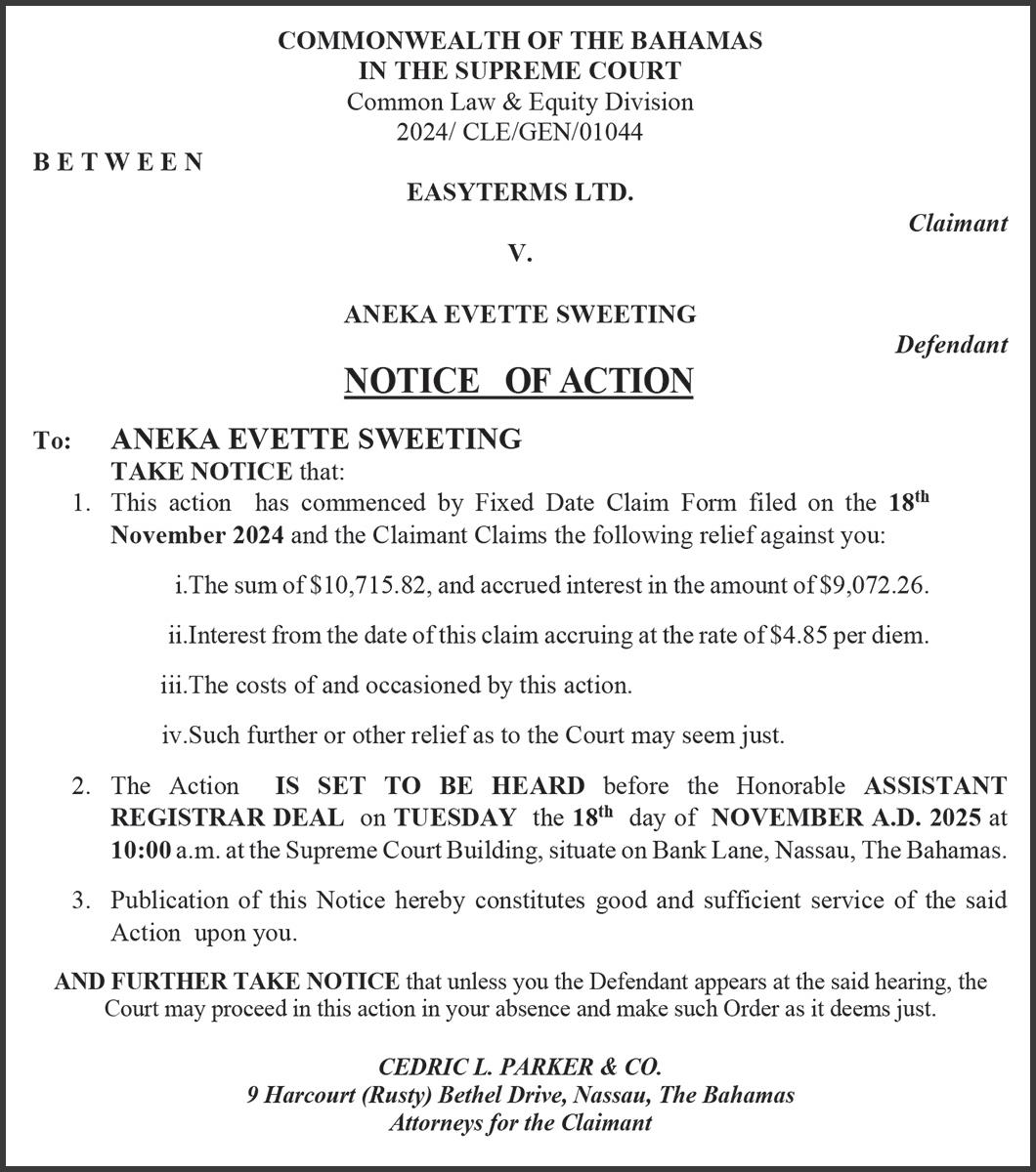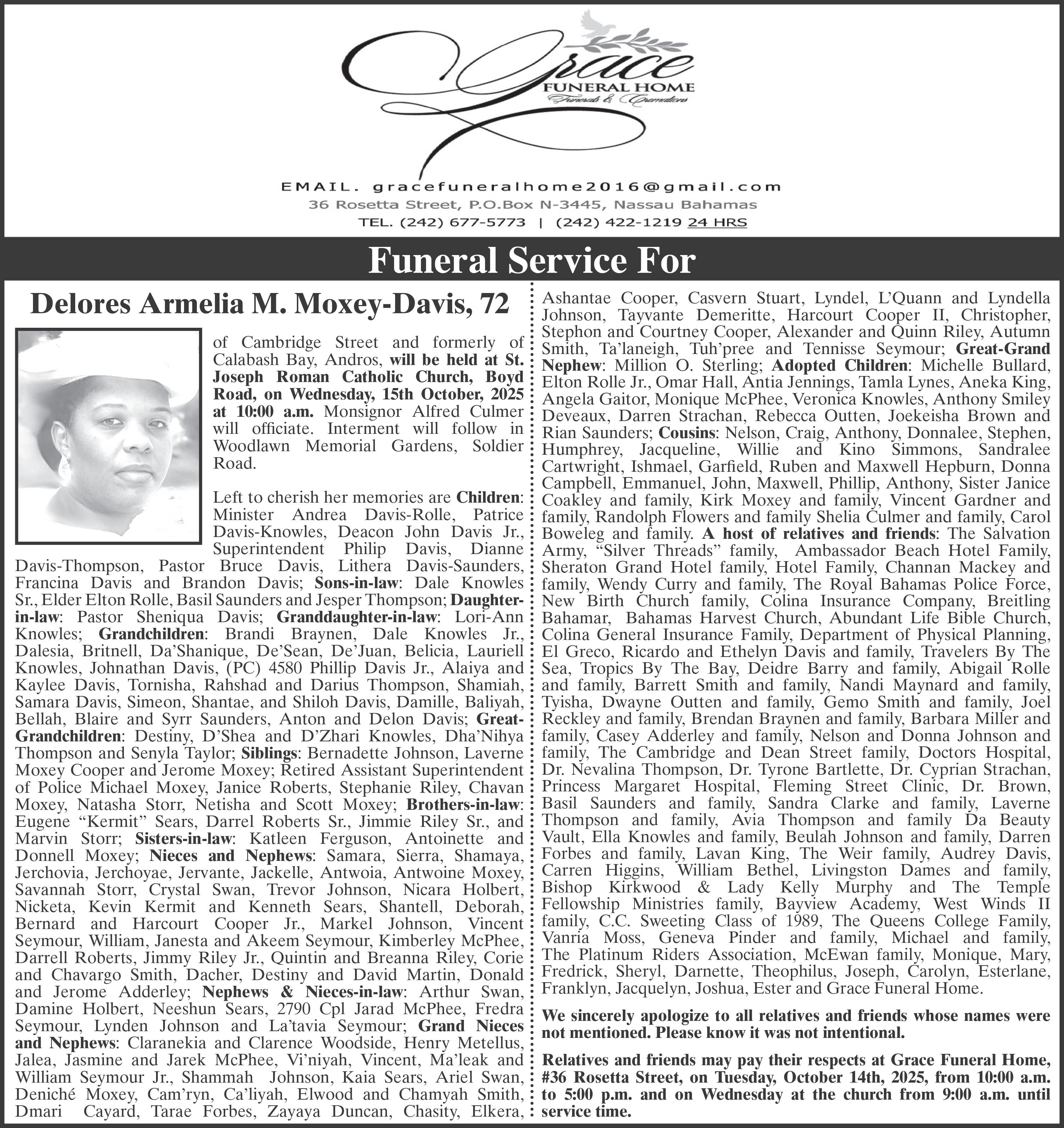 a resident of #13 Stew Fish Drive, will be held at Bahamas Harvest Church, John F. Kennedy Drive, on Thursday, October 16, 2025 at 10:00 a.m. Officiating will be Pastor Hervis Bain III. Cremation follows
