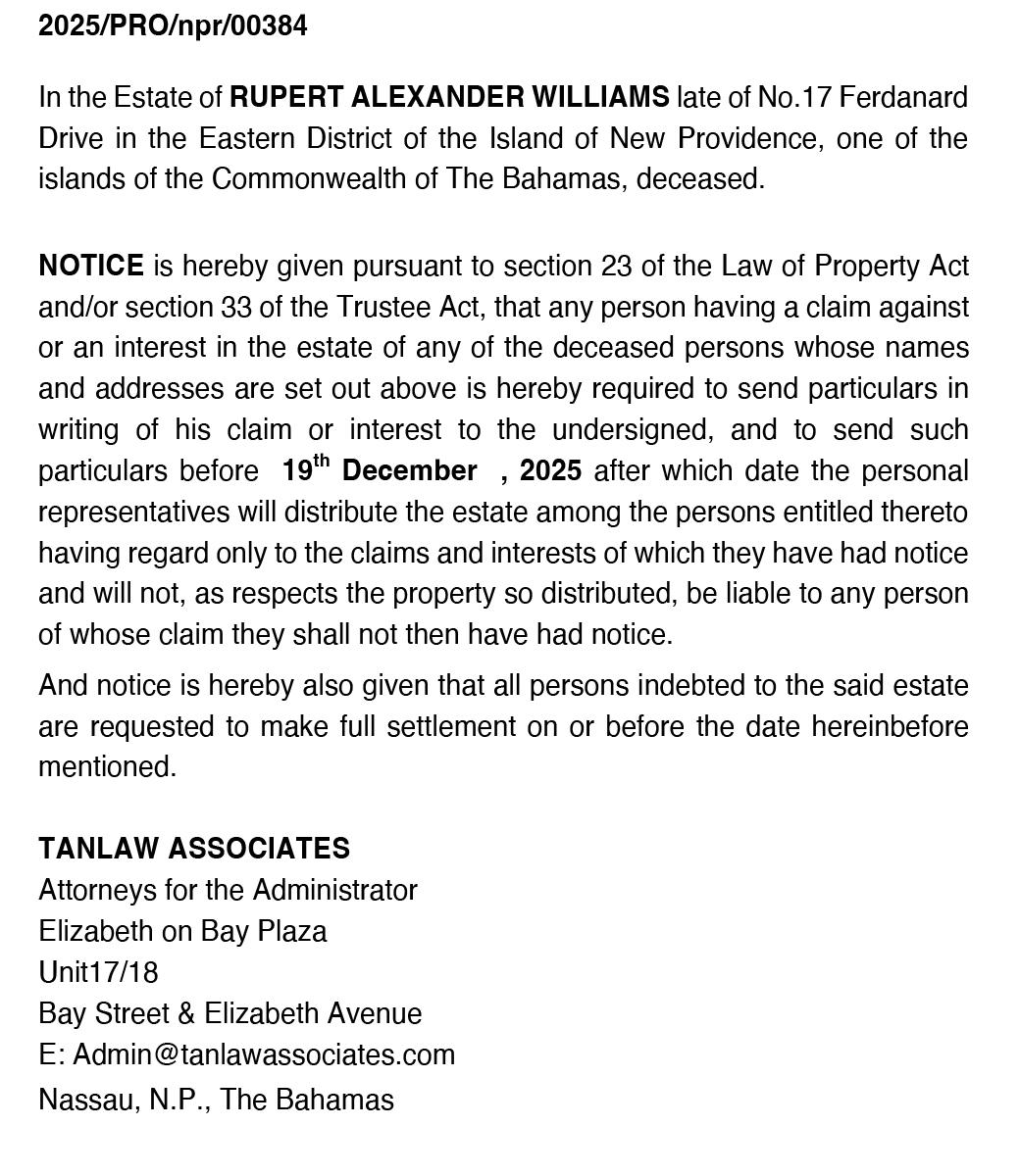 NOTICE is hereby given that ANNMARIE THELWELL of Colony Village, Prince Charles, Nassau, The Bahamas is applying to the Minister responsible for Nationality and Citizenship, for Registration/ Naturalization as a citizen of The Bahamas, and that any person who knows any reason why registration/naturalization should not be granted, should send a written and signed statement of the facts within twenty-eight days from the 16th day of October 2025 to the Minister responsible for nationality and Citizenship, P.O. Box N-7147, Nassau, New Providence, The Bahamas.