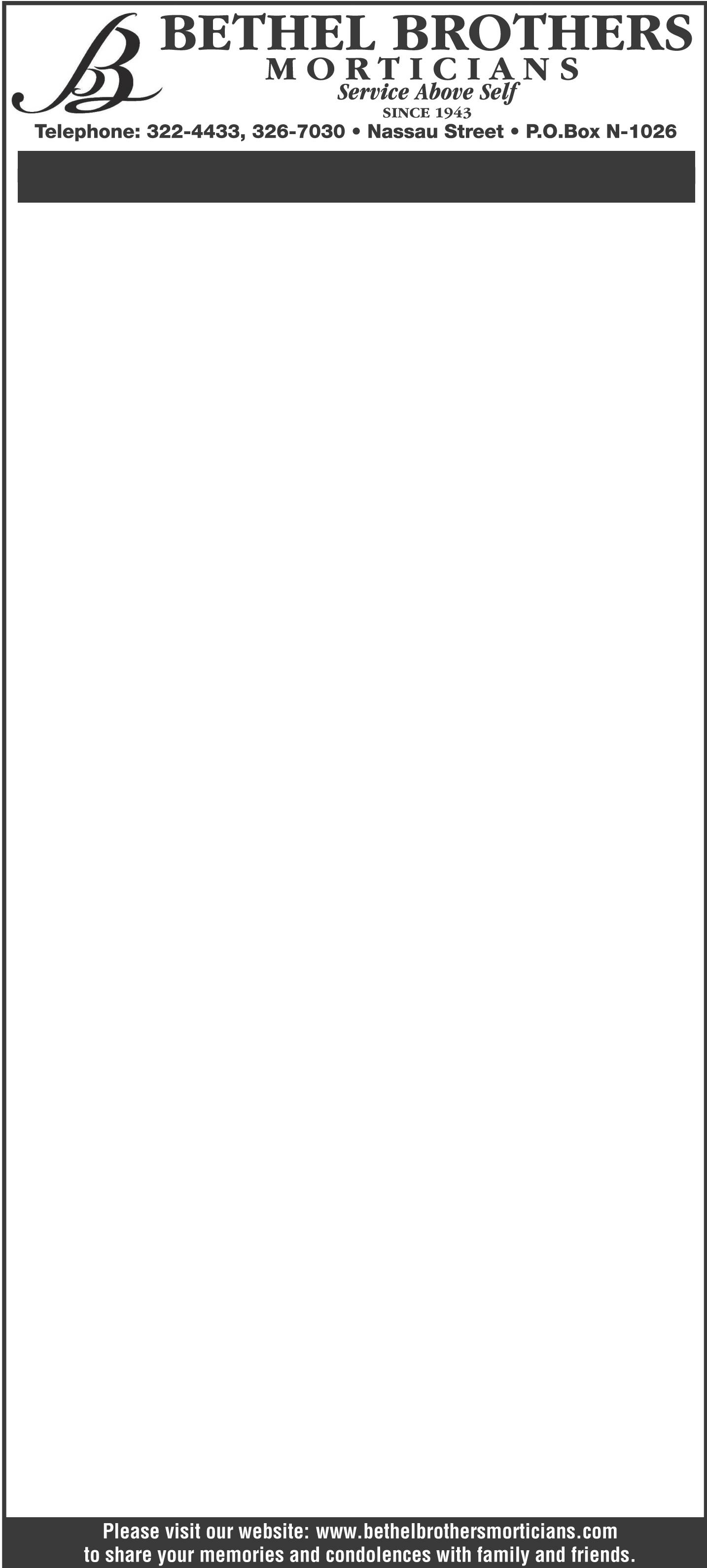 Left to cherish her memories, Daughters: Julia Storr and Margarette Rahming-Jones. Sons: Lettero Poitier and Pedro Morley. Grand children: Turkessa (Clinton) Henfield, Phillip Knowles, Julian Storr, Shando King and Ava Morley. Great-grandchildren: Nevaeh Henfield, Peyton and Paxton Knowles. Sisters: Julia Munroe, Reserve Inspector Peseretta Hicks, Branhilda Wallace-Whitfield, Brendalyn Neilly and Chief Customs Officer Alma Poitier- Sands. Two Brothers: Mitchell and Hezekiah Poitier. Nieces: Estelle, Nicole, and Patrice Evans, Miranda and Kimberley Munroe, Annischka Wilson, Arnette (Ricardo) Ingraham, Cynarra (Errol) Holmes, Keisha Edgecombe, Shannay (Samuel) Sawyer, Rokell Major, Samantha (Dario) Robinson, Sherell (Stanley) Bernard, Shalesia Bannister, Nadia Whyms, Ashley Poitier, Patrelle (Michael) Carey, Shaphelle Whyms, Joana Coleby, Dianne Wilson and Betty (Leonard) Robinson. Nephews: Wayne (Pamela) Munroe; Jaward, Ramesh, Zemesco, Wellington and Joshua Poitier; Authrey (Jaime), Alanzo (Megan), Chappell Whyms Jr. and Cedric