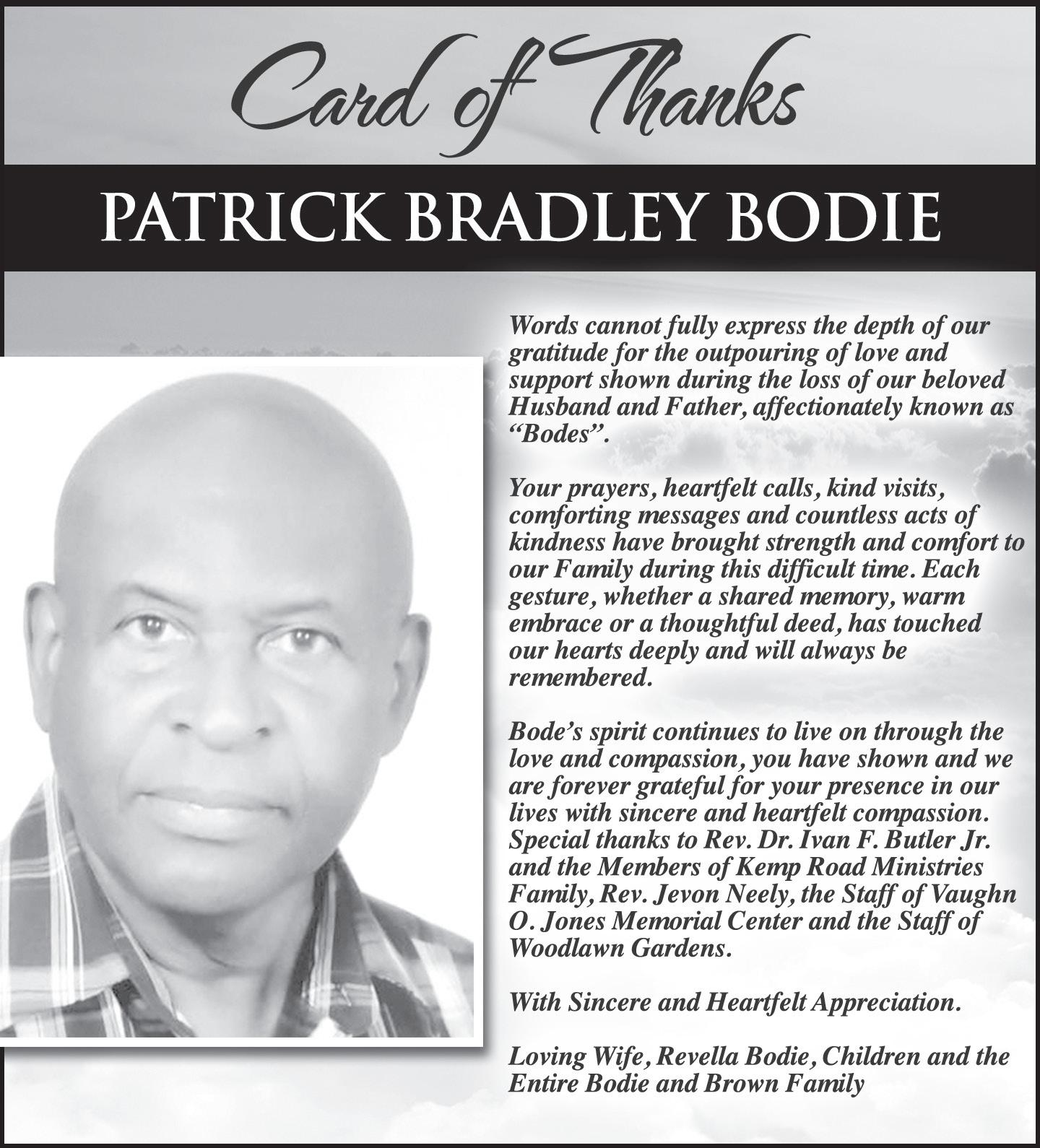 of Windward Road, Imperial Park, will be held at 11:00 a.m. on Saturday 8th November, 2025 at Zion South Beach Baptist Church, Zion Blvd., South Beach. Officiating will be Major Roodolph Meo, Major Carol Roberts and Rev’d. Dr. Anthony A. Sampson assisted by other ministers of the Gospel. Interment will follow in Woodlawn Gardens, Soldier Road.