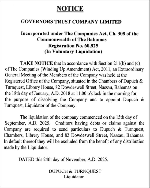 NOTICE is hereby given that DECAENEL PIERRE of Colony Village, Nassau, The Bahamas is applying to the Minister responsible for Nationality and Citizenship, for Registration/ Naturalization as a citizen of The Bahamas, and that any person who knows any reason why registration/naturalization should not be granted, should send a written and signed statement of the facts within twenty-eight days from the 19th day of November 2025 to the Minister responsible for nationality and Citizenship, P.O. Box N-7147, Nassau, New Providence, The Bahamas.