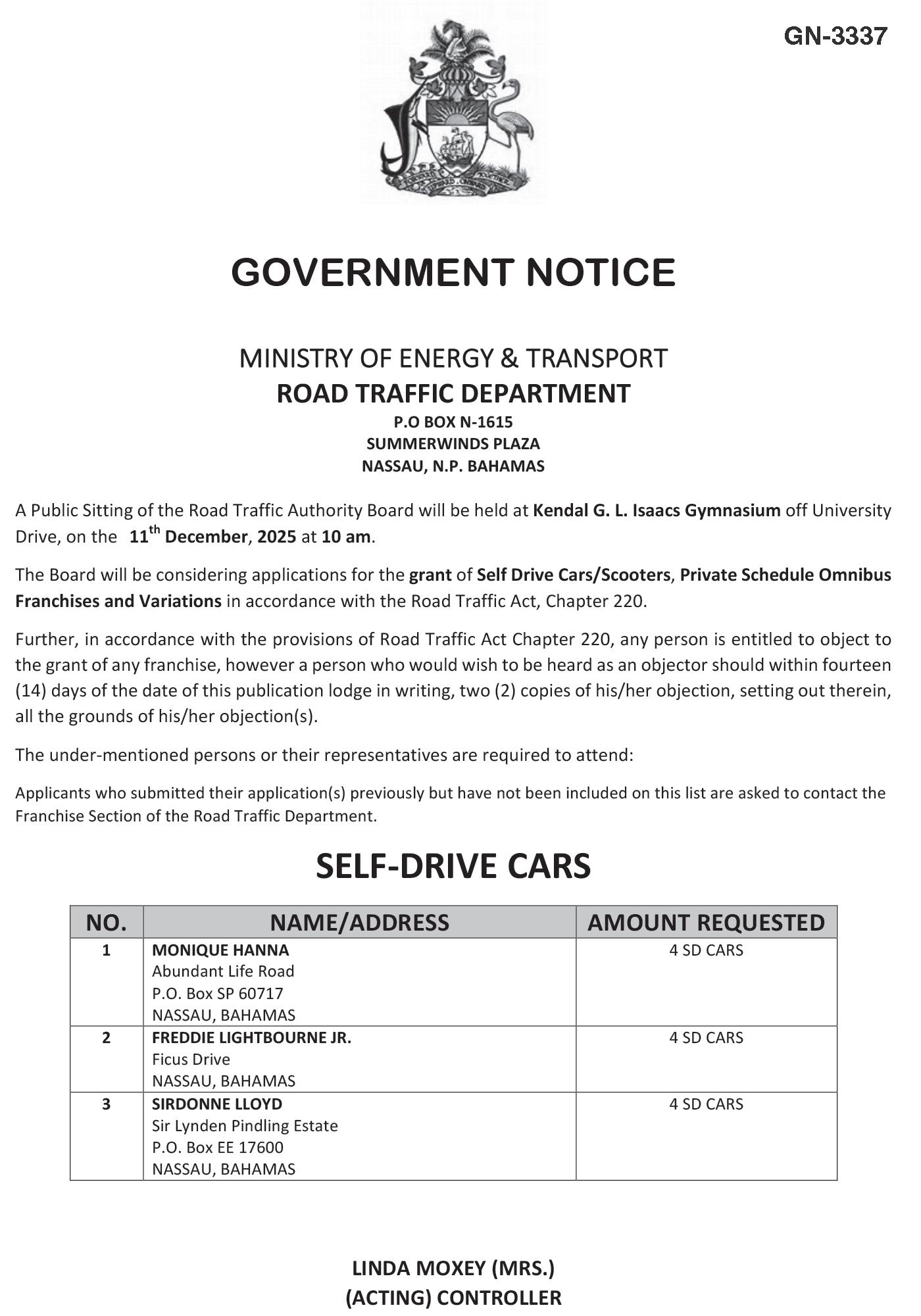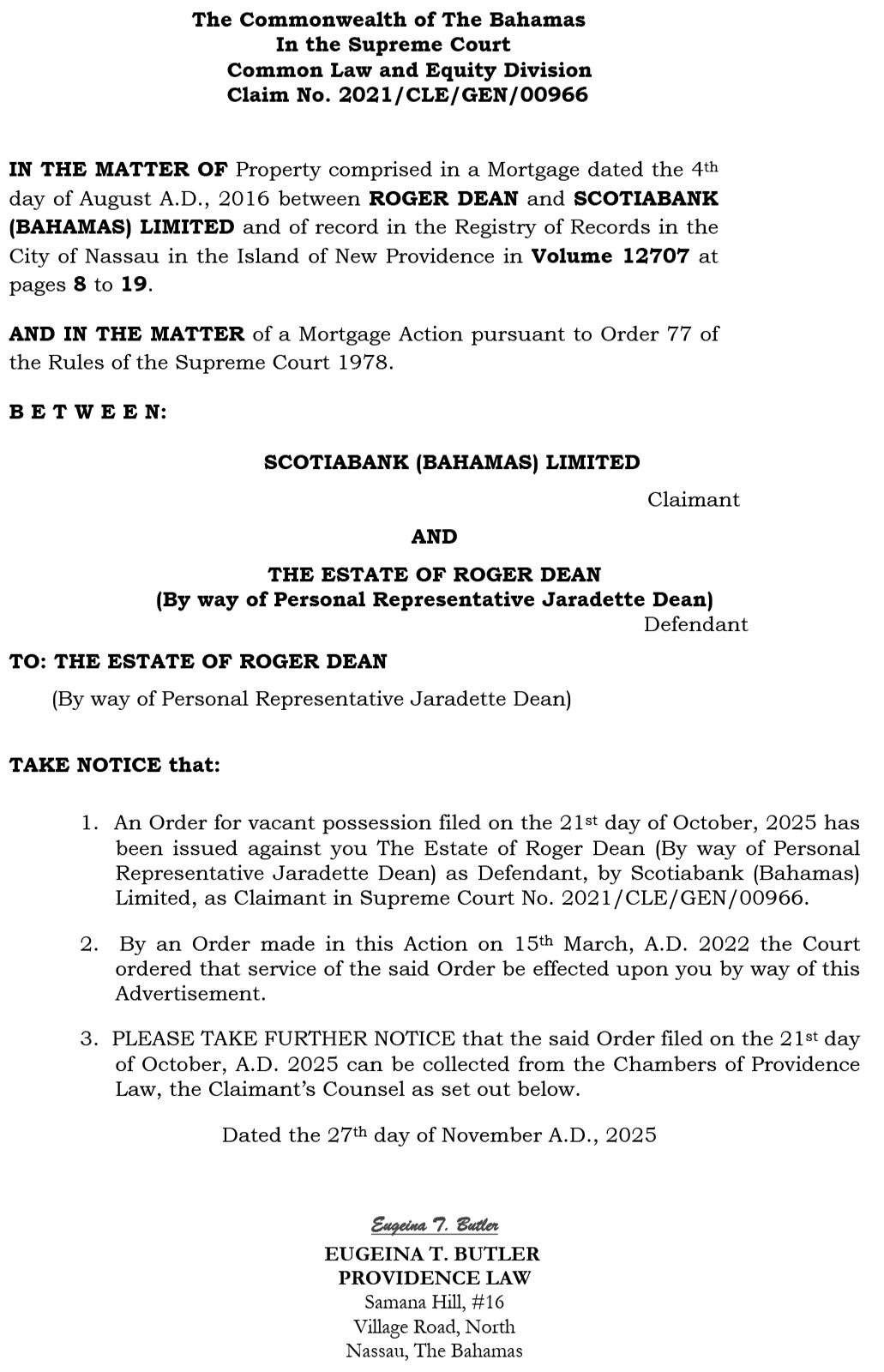 NOTICE is hereby given that ATRIN SWIFT of #16 Lumber Road, Malcom Road West Nassau, The Bahamas is applying to the Minister responsible for Nationality and Citizenship, for Registration/ Naturalization as a citizen of The Bahamas, and that any person who knows any reason why registration/naturalization should not be granted, should send a written and signed statement of the facts within twenty-eight days from the 1st day of December 2025 to the Minister responsible for nationality and Citizenship, P.O. Box N-7147, Nassau, New Providence, The Bahamas.