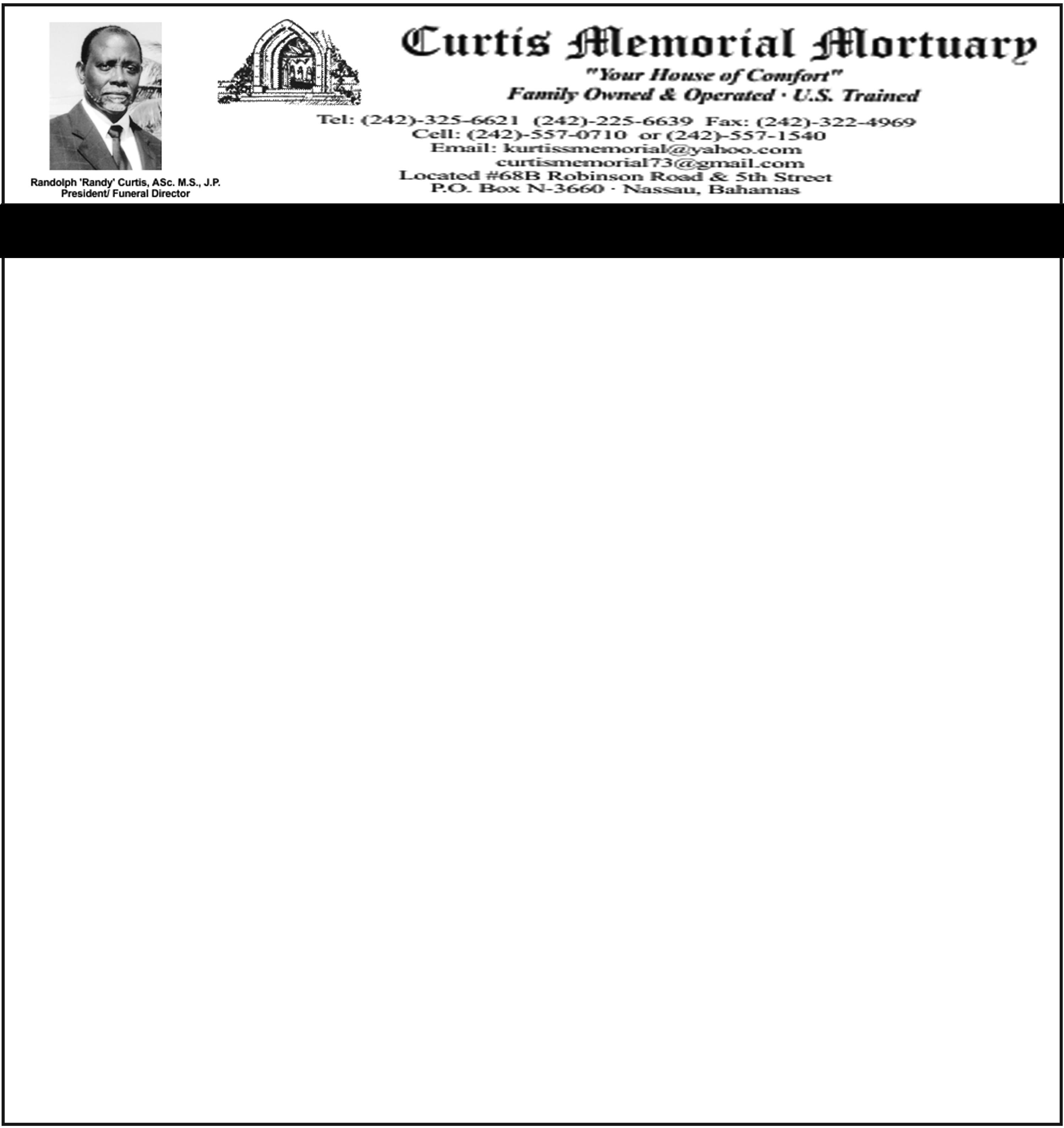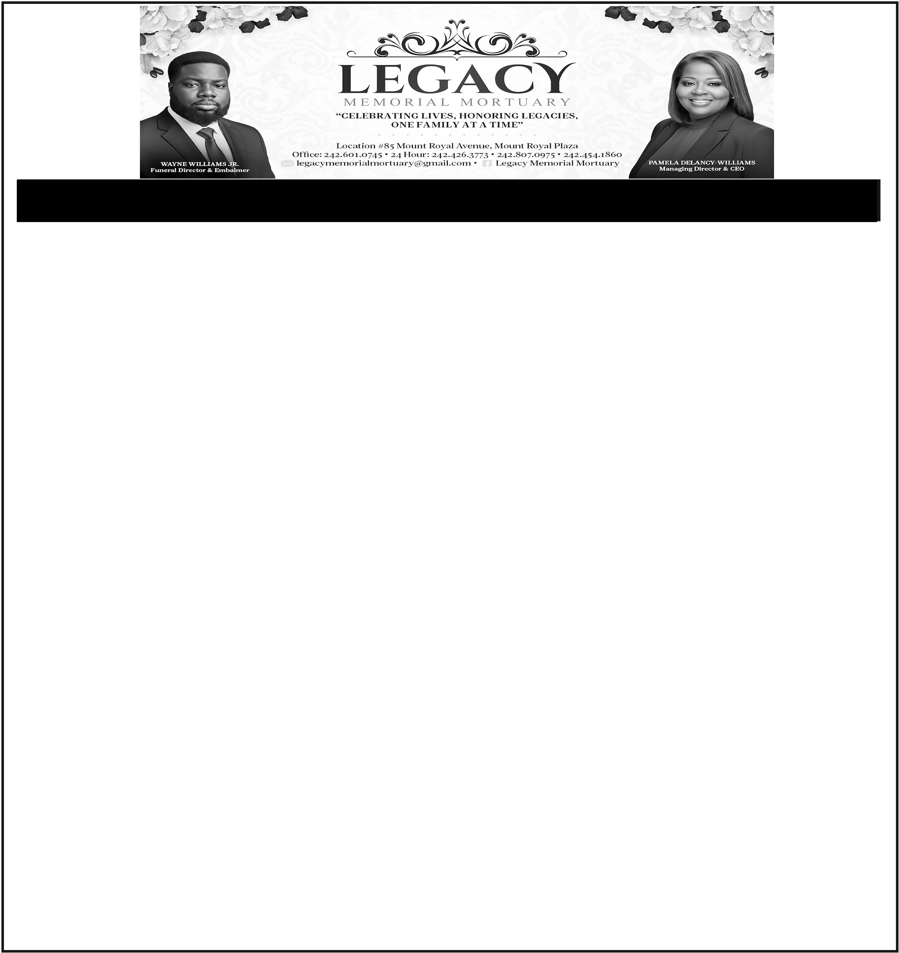 Friends may pay their last respects at Legacy Memorial Mortuary, #85 Mount Royal Avenue, Mount Royal Plaza, New Providence on Friday, December 5th, 2025 from 10:00am-5:00pm & at the church on Saturday from 10:00am until service time.