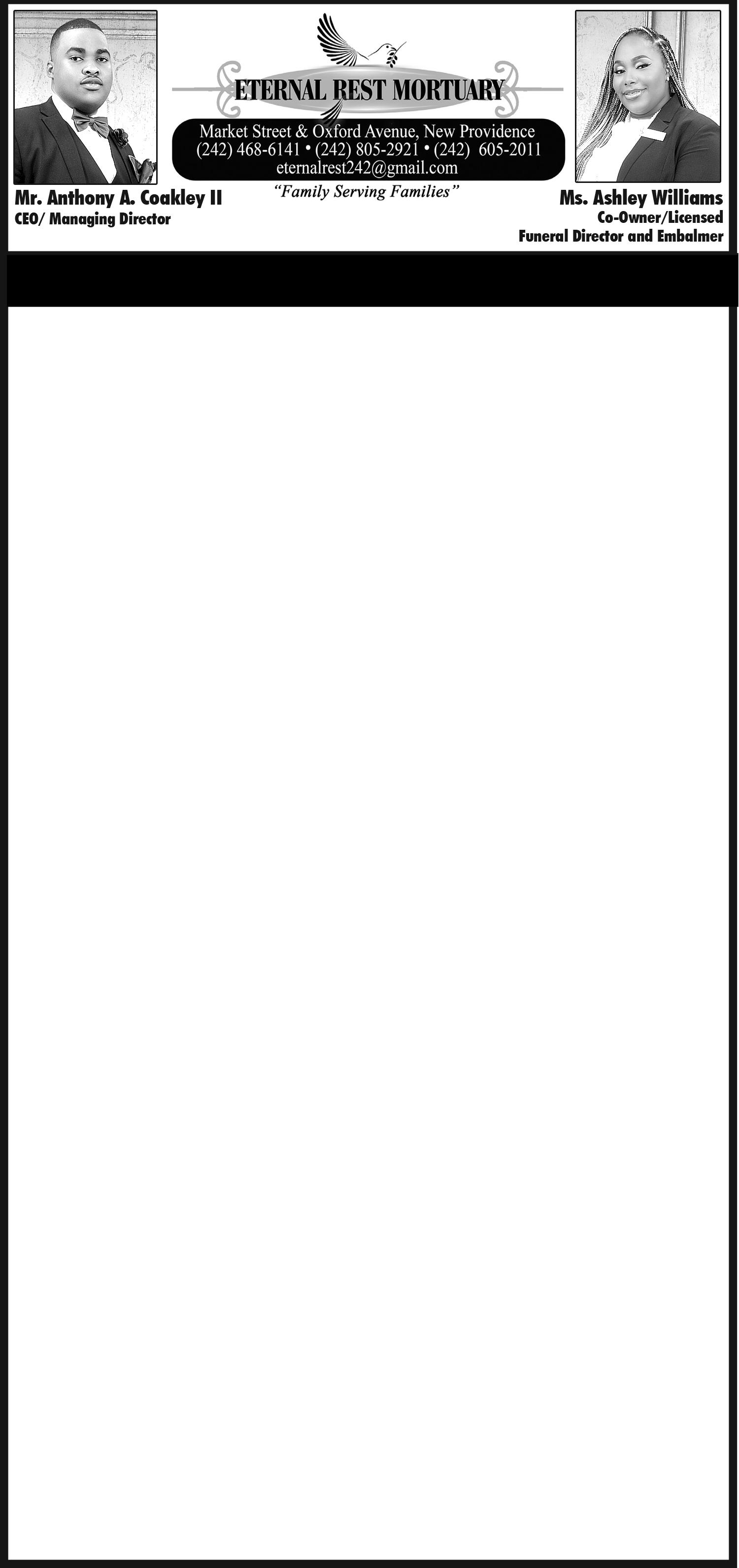 . Viewing will be held in the “Royal Suite”, at Westside Memorial Mortuary, Hanna Hill Eight Mile Rock, Grand Bahama on Friday, December 5, 2025 from 12:00 noon to 6:00pm.