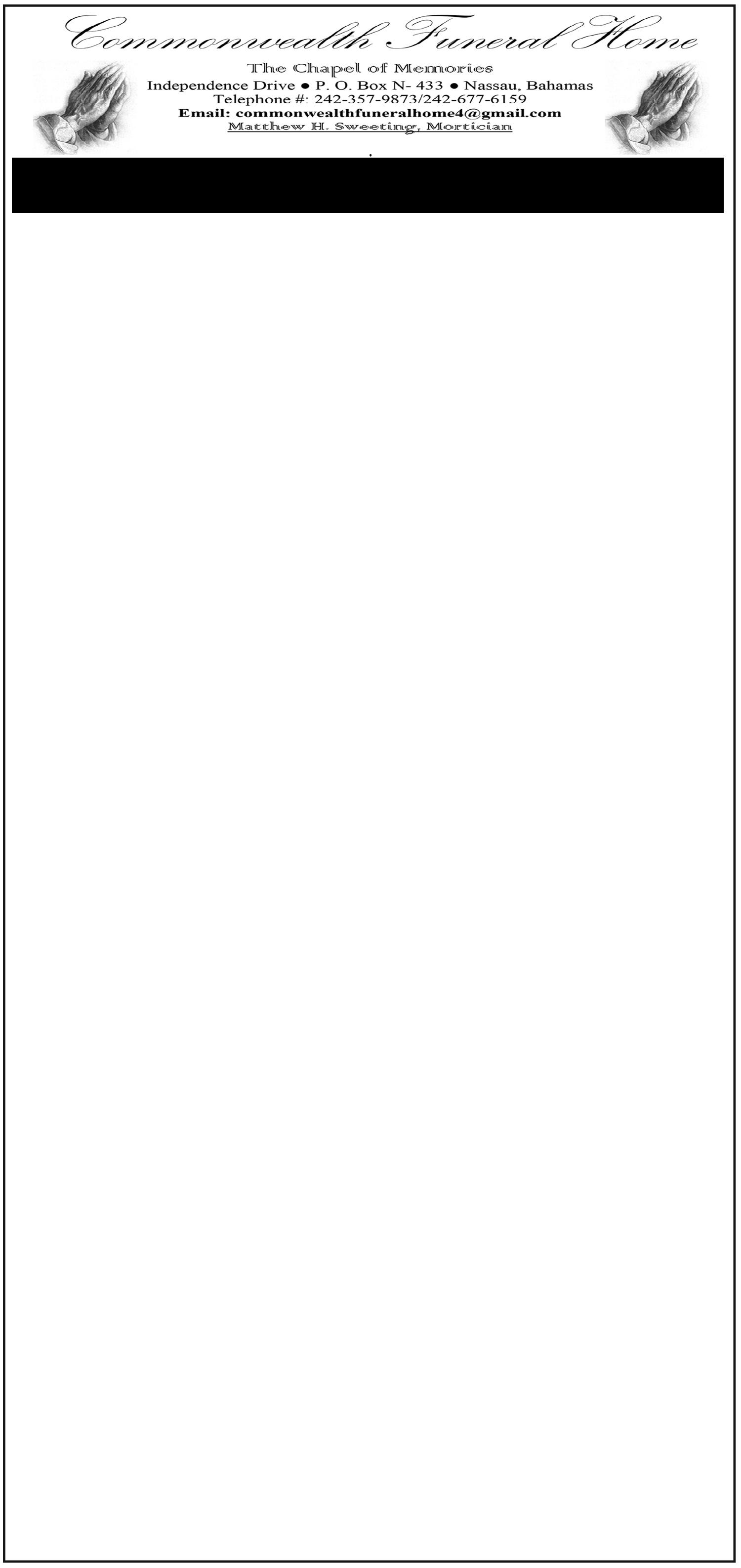 The body will repose at the Chapel of the Saints, Sweeting’s Colonial Mortuary #54 Blue Hill Road, Nassau, Bahamas on Friday and from 10:00 am to 5:00pm and on Saturday at the church from 10:00am until service time.
