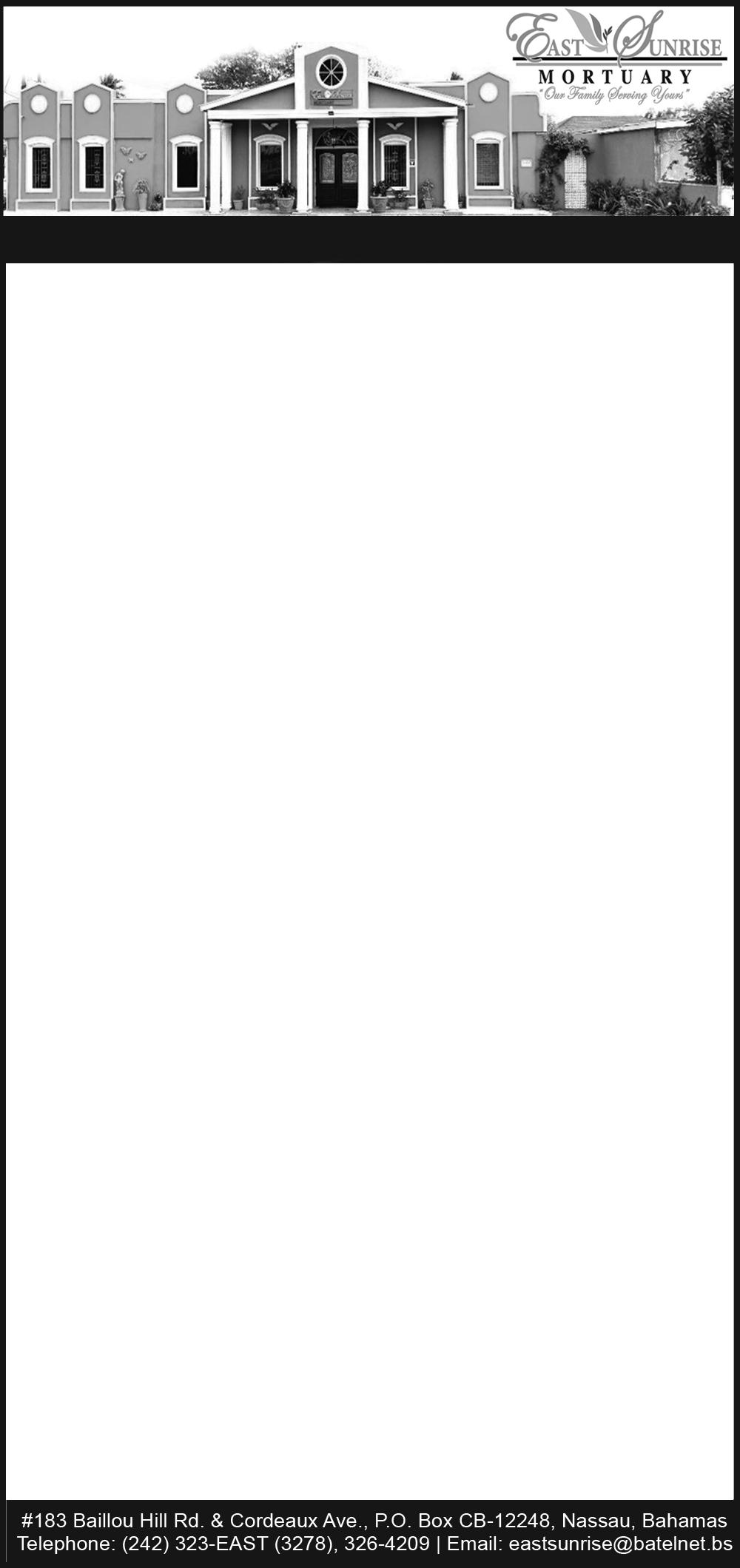 of Lewis Street, New Providence, Bahamas and formerly of Eight Mile Rock, Grand Bahama, Bahamas will be held on Saturday, December 6, 2025 at 10:00am at Church of God of Prophecy, Sea Grape Eight Mile Rock, Grand Bahama. Officiating will be Bishop Keith Palmer assisted by Pastor Shavago Dames and Minister Roselyn Lightbourne. Interment will follow at Harbour West Public Cemetery.