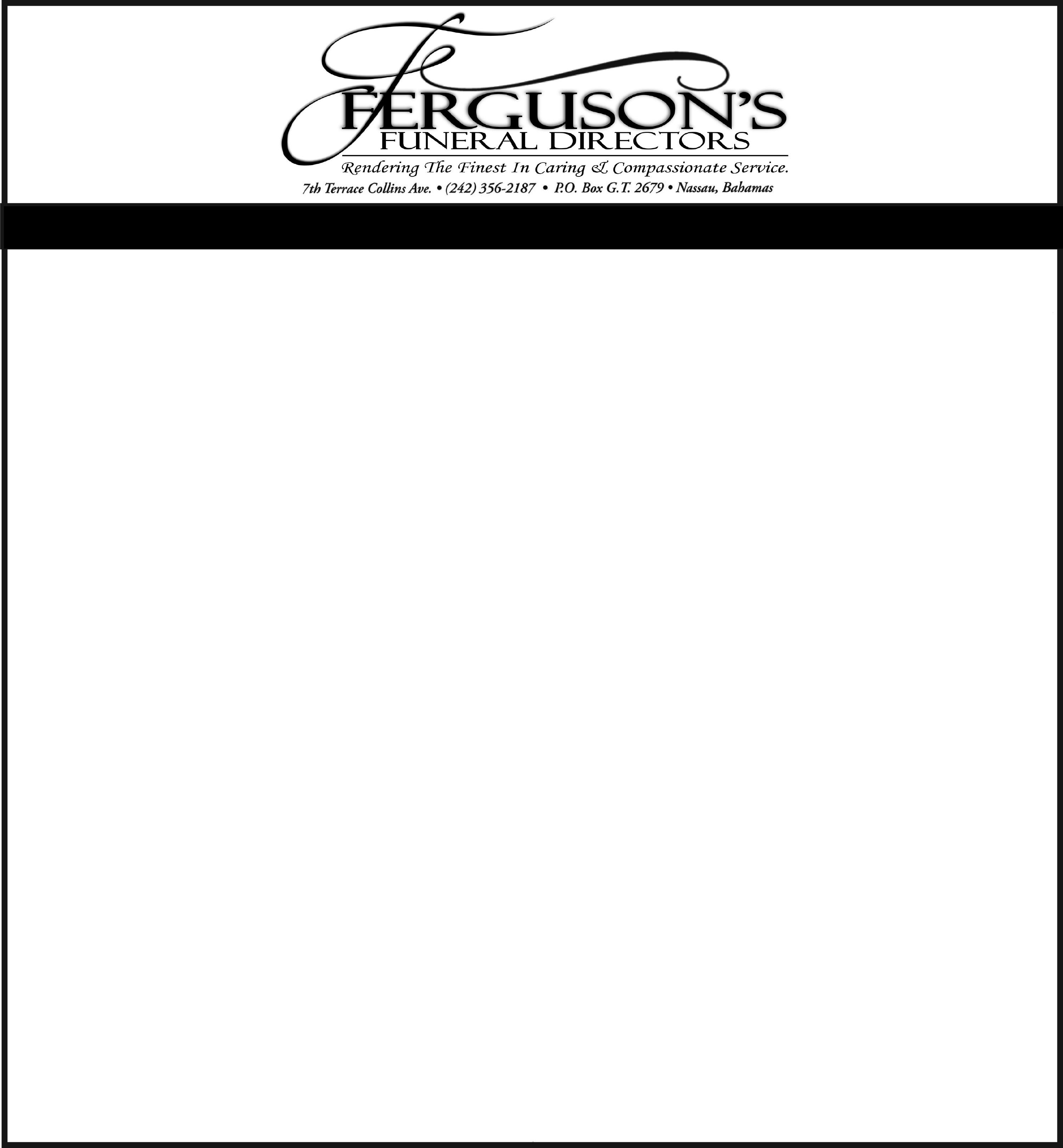Viewing will be held in the “Celestial Suite” at Restview Memorial Mortuary and Crematorium Limited, #11-A Coral Road, Freeport, Grand Bahama on Friday from 10:00 a.m. to 5:00 p.m. and at the Church on Saturday from 11:30 a.m. until service time.
