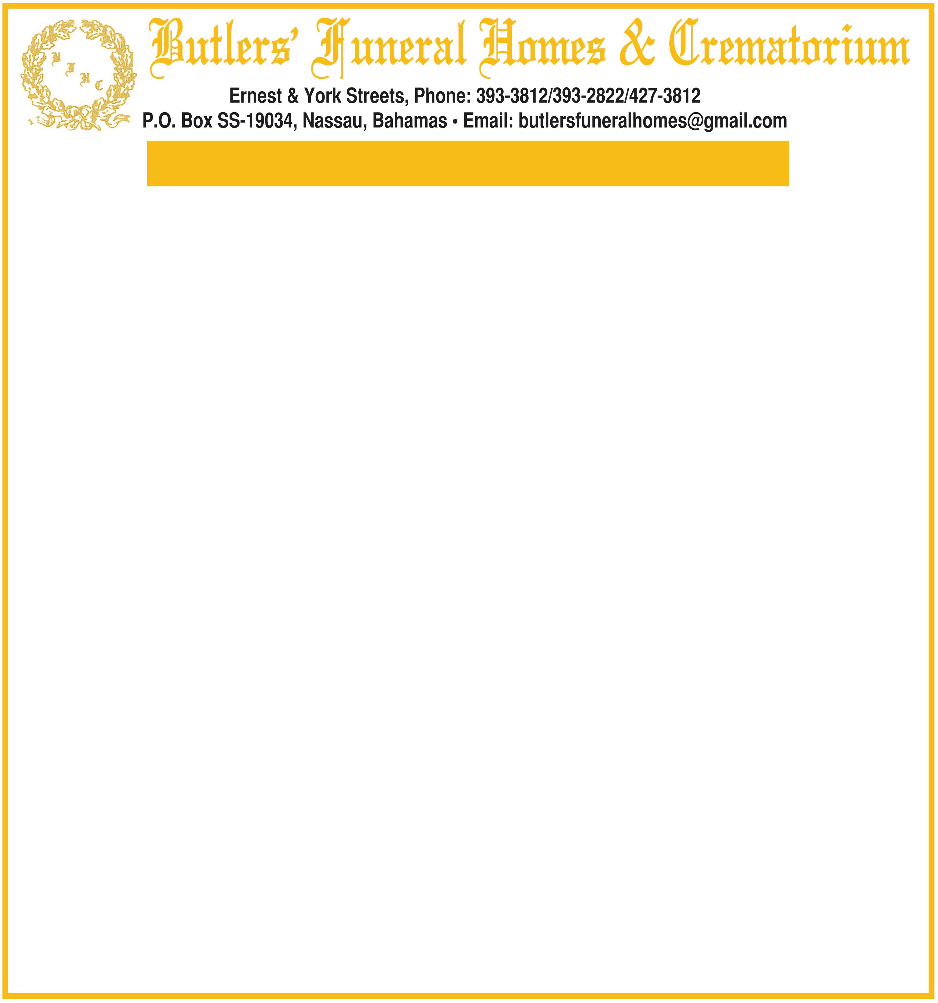 A host of relatives and friends including: Ruth Bodie, Peter Bodie, Charmaine, William Miller, Stafford Miller, Bob Miller, Wellington Miller, and Louise Miller, Joyann Miller, Vandolyn Mortimer, The Thurston Family, The Harris Family, Beverly, Marina Knowles, Mario Simms, Akera Johnson-Simms, The Pelicanos Family, the Williams Family, Lillian Fox, the Fox Family of Salt Pond and the entire Salt Pond Community, Leslie French, friends and neighbours of the Wulff Road Community, management and staff of the d’Albenas Agency, doctors, nurses and staff of Doctors’ Hospital, Poinciana Recovery Centre, and Princess Margaret Hospital, and the Honorable Glenys Hanna Martin, Member of Parliament for the Englerston Constituency.