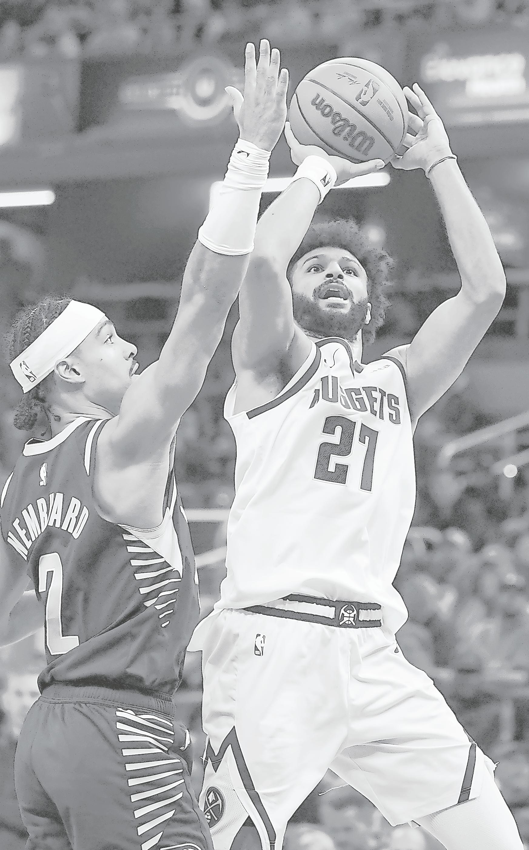 NUGGETS guard Jamal Murray (27) shoots over Indiana Pacers guard Andrew Nembhard (2) during the second half on Wednesday, December 3, 2025. (AP Photo/Michael Conroy)