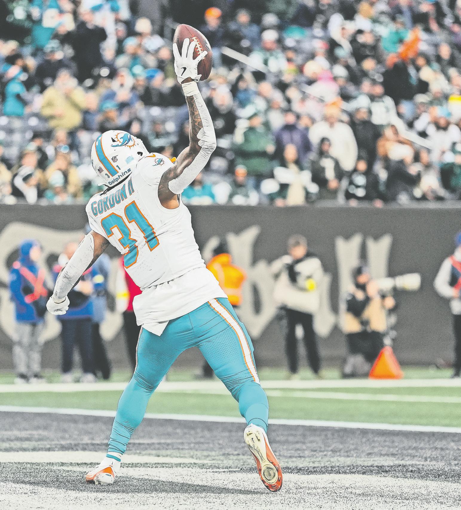 running back Ollie Gordon II (31) reacts after scoring a touchdown against the New York Jets during the fourth quarter yesterday. (AP