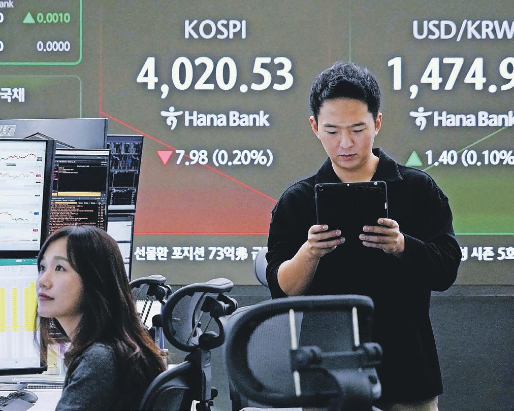 CURRENCY traders work near a screen showing the Korea Composite Stock Price Index (KOSPI) and the foreign exchange rate between U.S. dollar and South Korean won, top right, at the foreign exchange dealing room of the Hana Bank headquarters, in Seoul, South Korea, Friday, Dec. 5, 2025. Photo:Ahn Young-joon/AP