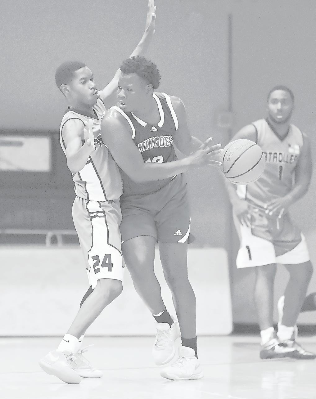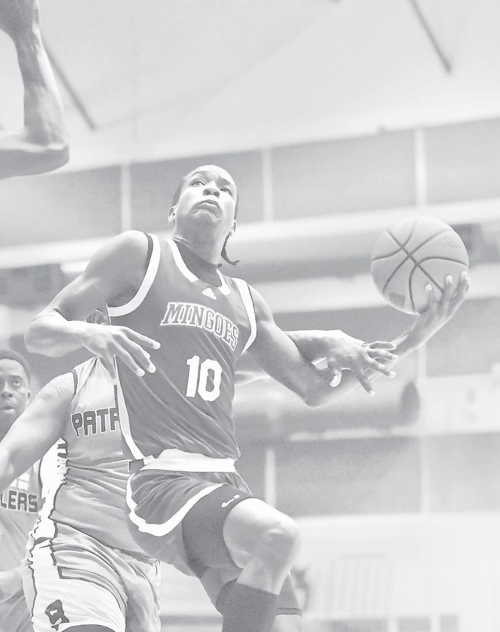 MINGOES forward Terrance Higgs goes for the layup. MINGOES forward Alex Minus fights off a defender.