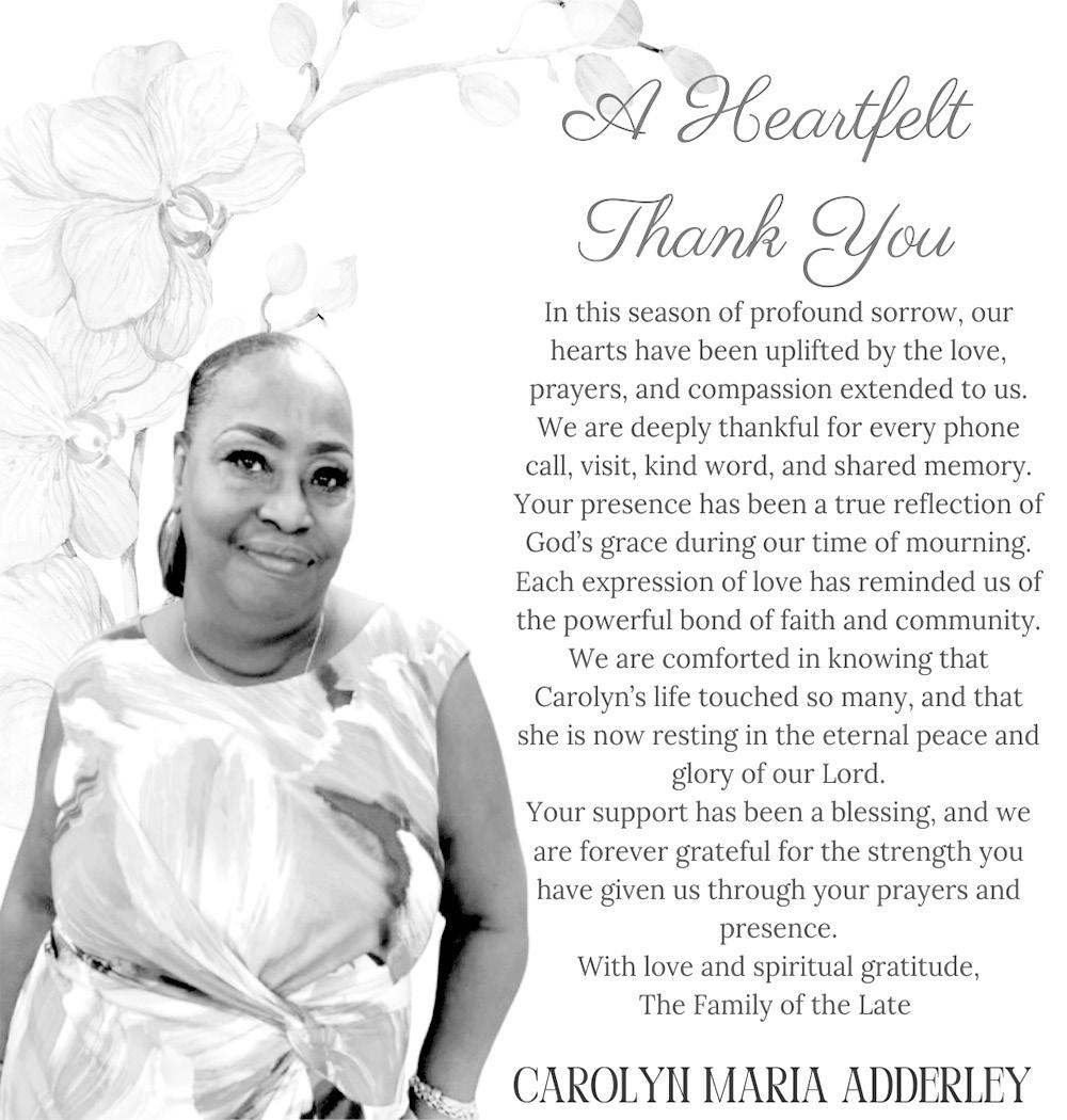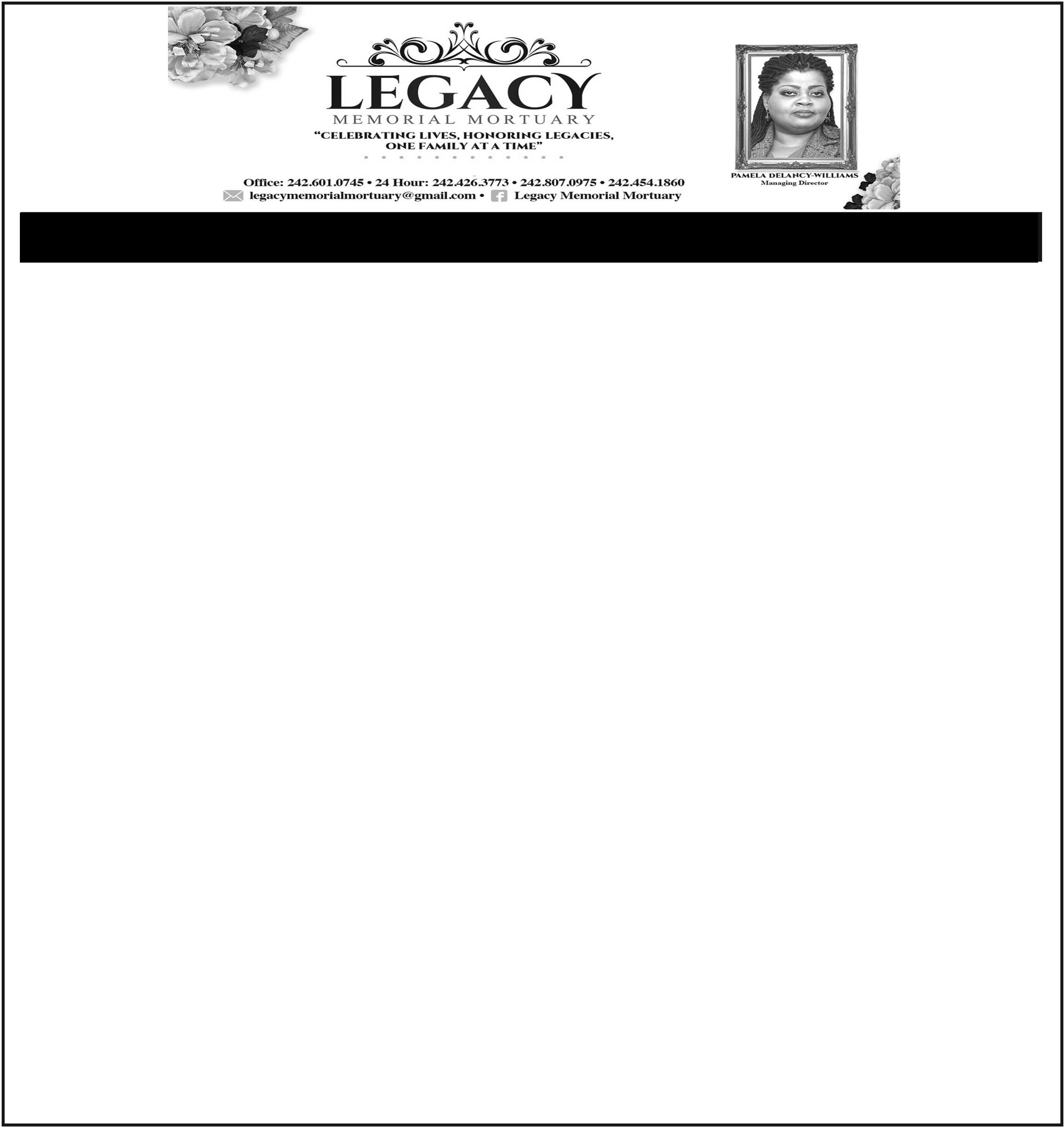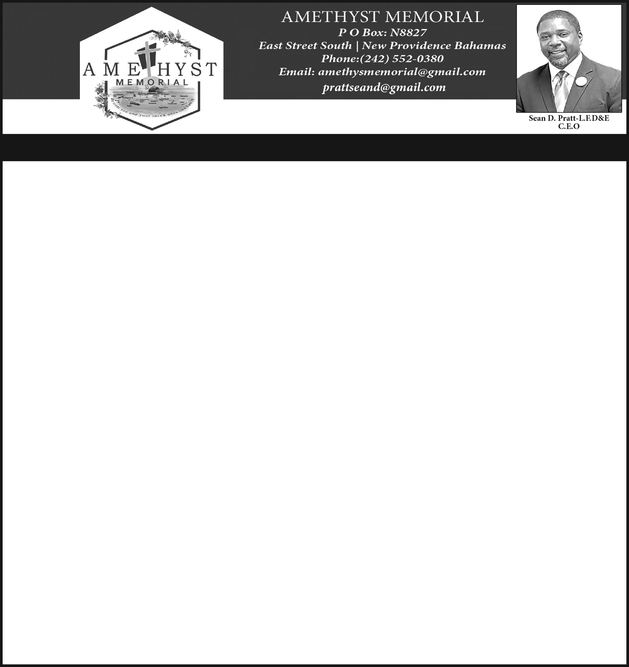 Relatives and Friends may sign the memorial book at Eternal Rest Mortuary, #244 Market Street and Oxford Avenue, New Providence on Friday, 15th August, 2025 from 10:00 a.m - 5:00 p.m. and again at the Chruch on Saturday, 16th August, 2025 from 10:00 a.m. until end of service.