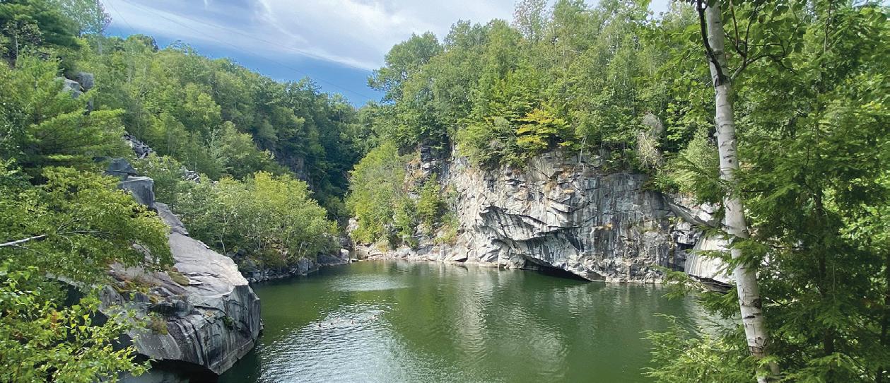 Off of Quarry Road in the town of Becket, a snapshot of the western Berkshires’ industrial past presents itself at walking speed. Pebbly debris spilling down a ridge like crumble from a coffee cake, rusted compressor trucks that haven’t moved in more than 70 years, a half-mile access road that was once a rail bed, a massive crane towering above 75-foot cliffs that rise from an inky pool—all are relics of a quarry that, for nine decades, extracted and transported prized granite before being abandoned to the elements. It’s as though one day the quarrymen simply walked off the job and never came back.