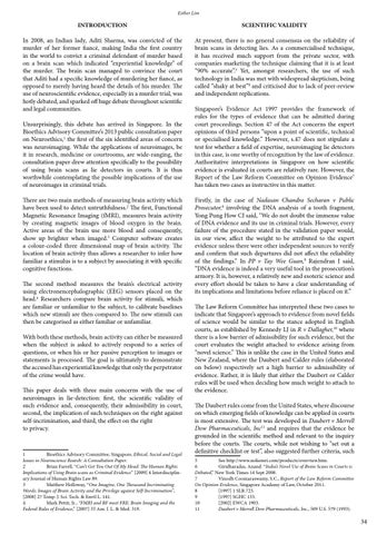 1 Bioethics Advisory Committee, Singapore, Ethical, Social and Legal Issues in Neuroscience Rearch: A Consultation Paper. 2 Brian Farrell, “Can’t Get You Out Of My Head: The Human Rights Implications of Using Brain scans as Criminal Evidence” [2009] 4 Interdisciplinary Journal of Human Rights Law 89. 3 Matthew Holloway, “One Imagine, One Thousand Incriminating Words: Images of Brain Activity and the Privilege against Self-Incrimination”, [2008] 27 Temp. J. Sci. Tech. & Envtl L. 141. 4 Mark Pettit, Jr., “FMRI and BF meet FRE: Brain Imaging and the Federal Rules of Evidence,” [2007] 33 Am. J. L. & Med. 319.