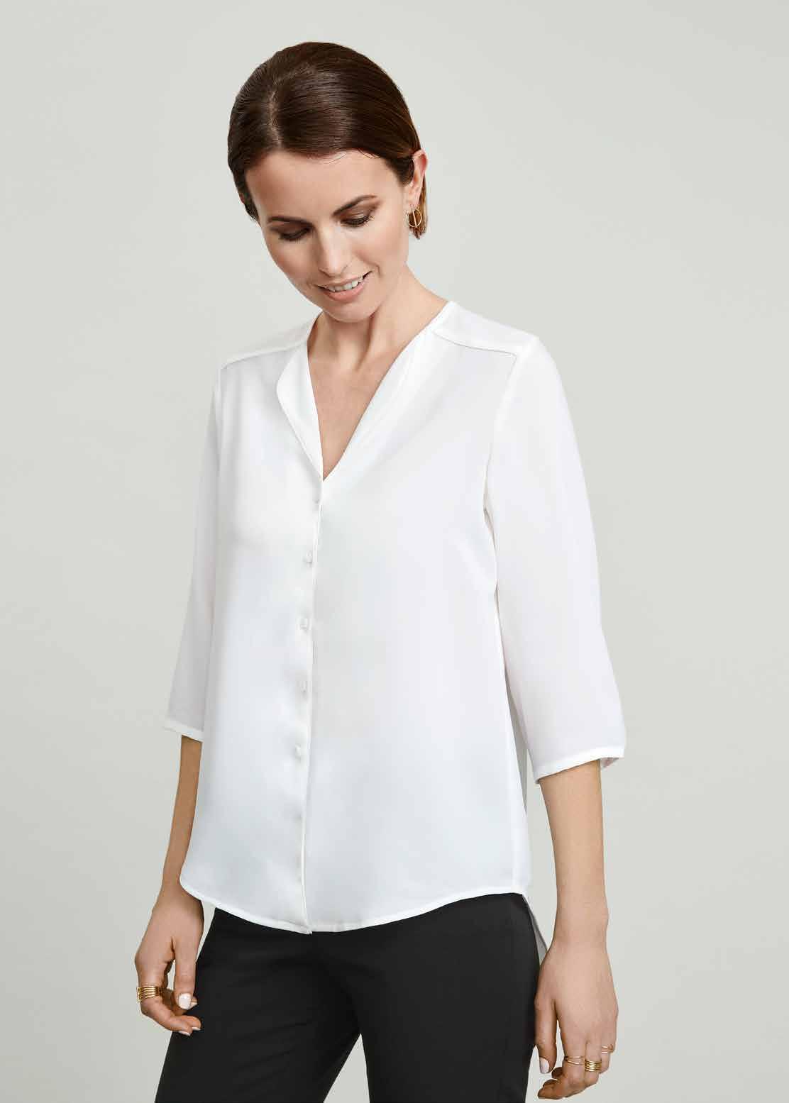 FEATURES Semi-fitted button through wrap over styling • “V” Shaped neck with mandarin collar • Longer line with deep side splits