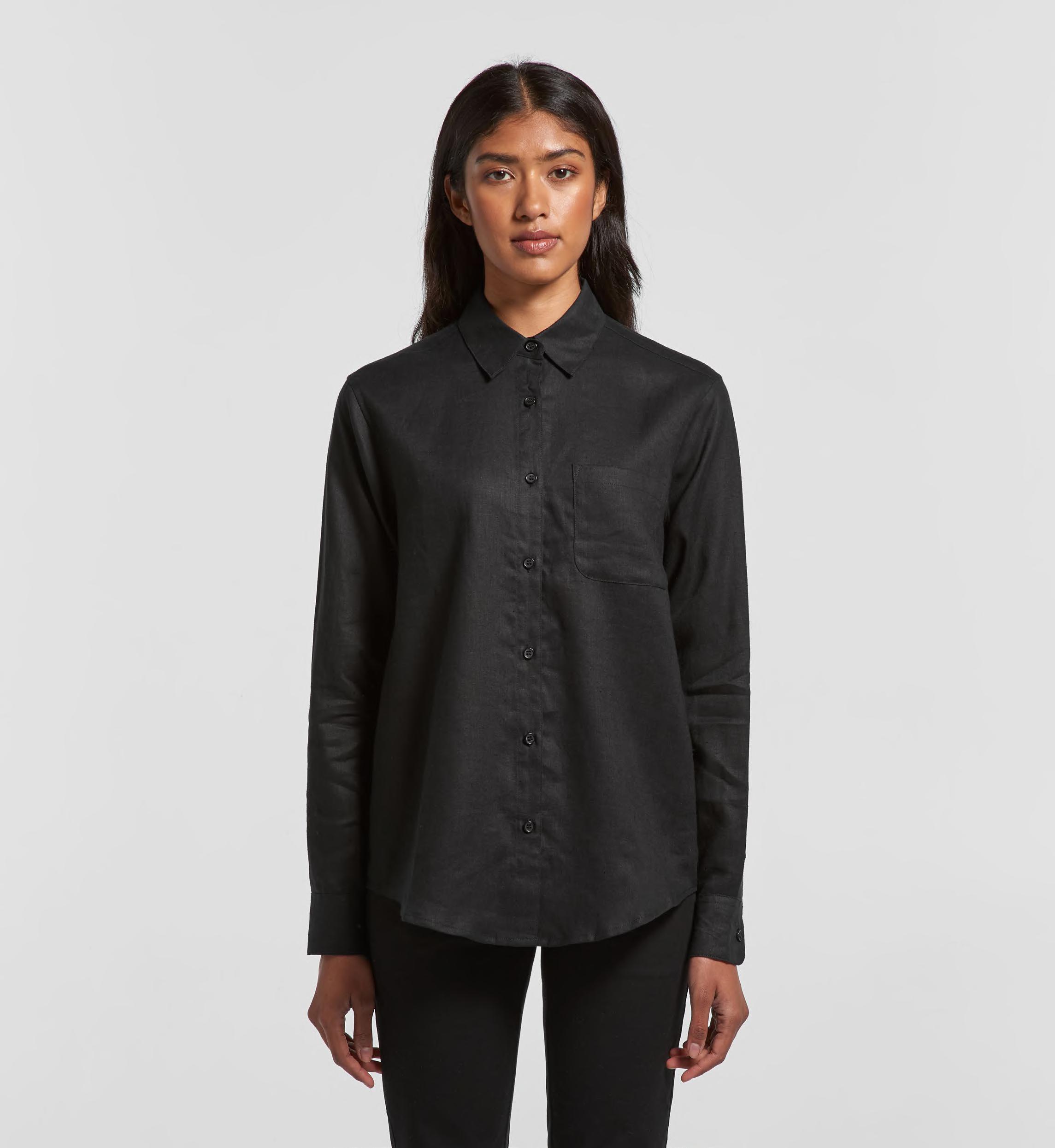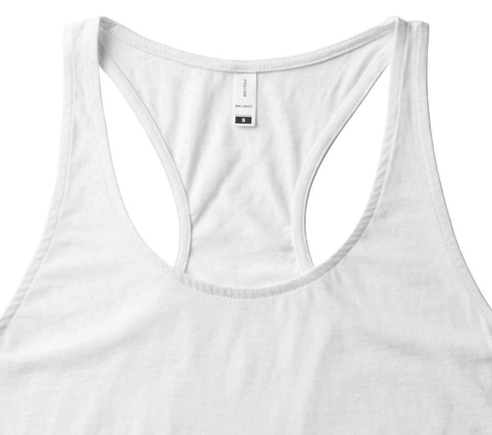 Curved hem, self-fabric bindings at neck and armhole, double needle bottom hem, preshrunk to minimise shrinkage
