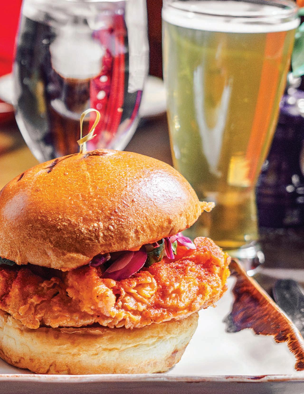 Pictured is the Nashville Hot Chicken Sandwich, finished with purple cabbage slaw, housemade pickles, hot pepper mayo and served on a brioche bun with a side of our signature chips.