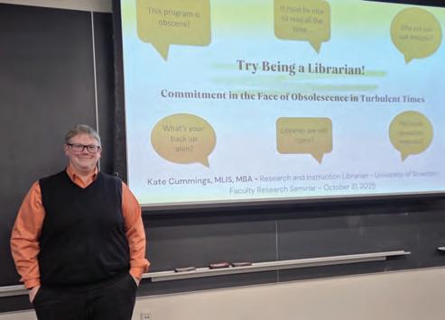 Kate Cummings’ talk, titled “Try Being a Librarian! Commitment in the Face of Obsolescence in Turbulent Times,” was held on Oct. 31. Prof. Cummings presented her research on professional insecurity within the library profession.