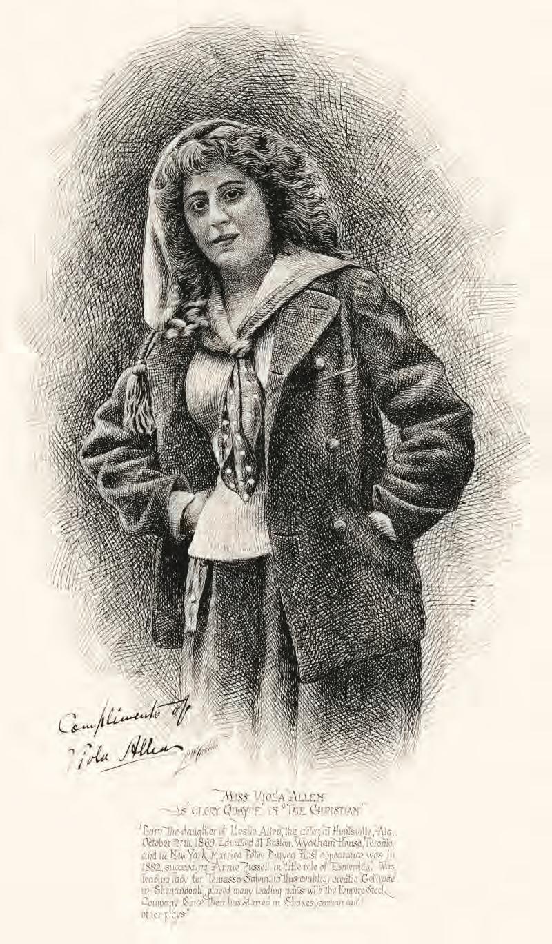 Autographed pen and ink drawing (dated ca. 1901) of American stage and silent film actress Viola Allen (1867-1948) as Glory Quayle in “The Christian,” a role she created. Allen performed in Scranton, Pennsylvania, four times between 1901 and 1911. Artist P.W. Costello met her during an exhibition of his portraiture held in the lobby of the Lyceum Theatre when she was performing in Scranton.