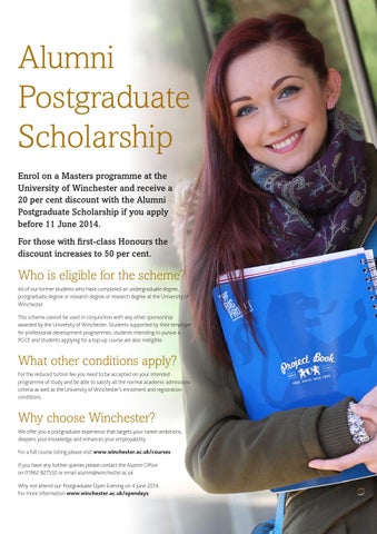 Alumni Postgraduate Scholarship Enrol on a Masters programme at the University of Winchester and receive a 20 per cent discount with the Alumni Postgraduate Scholarship if you apply before 11 June 2014. For those with first-class Honours the discount increases to 50 per cent.