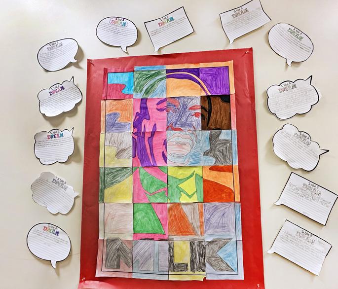 Fourth graders puzzled together a large portrait of Dr. Martin Luther King Jr. and decorated it with their own dreams. They created illustrated timelines highlighting important events in history to recognize the efforts that African Americans have made in the struggle for equity and justice.