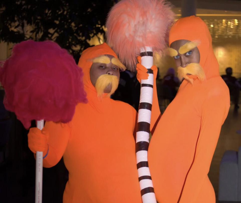 Two people humorously dress as the Lorax on Halloween, wearing matching outfits and holding Truffula trees.