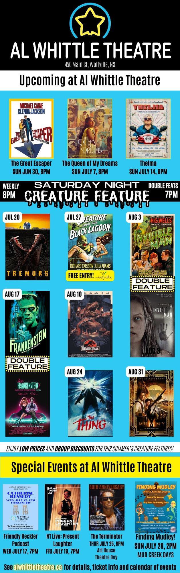 Did you just feel that? The thrill of anticipation? The chill up your spine? Oh yes, it’s Creature Features on Saturdays in Wolfville! From July 20th to August 31st, head to Wolfville’s beloved Al Whittle Theatre to dive into the world of monsters, mutants, and mysterious beings that lurk in the shadows. Everything from underground monsters to dinosaurs to... Things... will be showing.