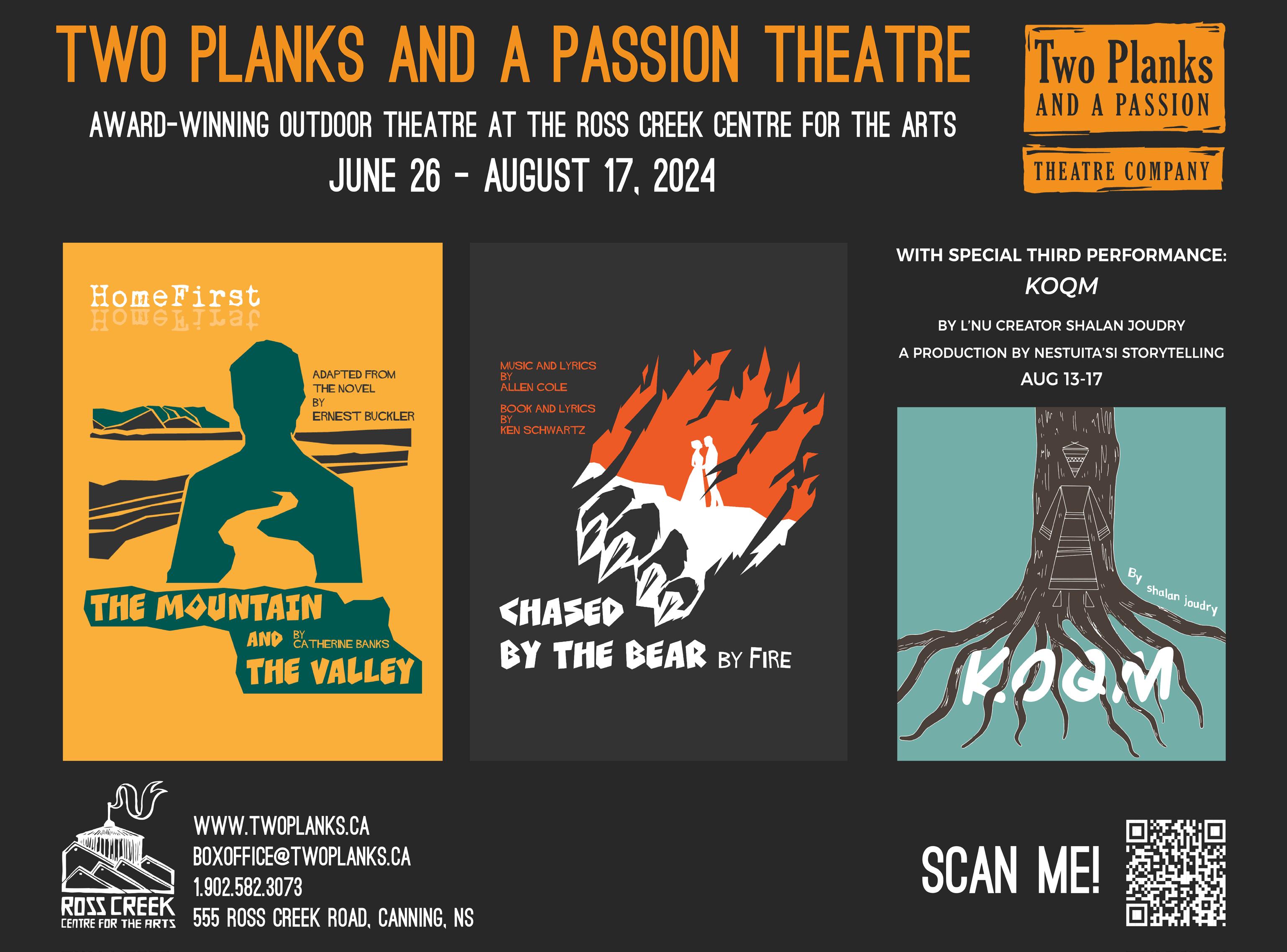 And of course, our resident professional theatre company, Two Planks and a Passion Theatre, is presenting three shows on the grounds of the Ross Creek Centre for the Arts. The Mountain and the Valley opens on June 29th, the fireside musical Chased by the Bear opens on July 6th, and KOQM, written and performed by L’nu artist shalan joudry, takes place in August on the land. Tickets are available at artscentre.ca. There are many more events this summer, including theatre talkbacks, Annex events, and performances. We hope to welcome you.