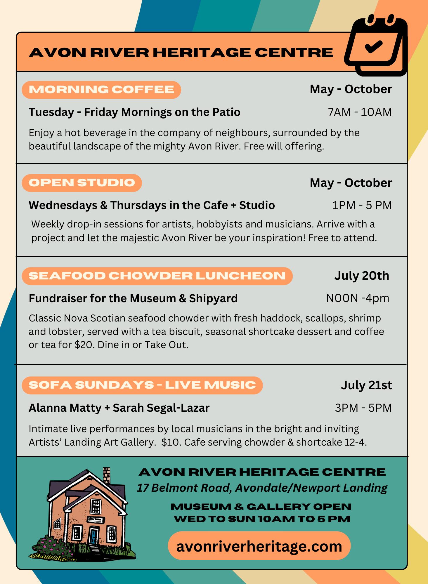Micci’s Musical Theatre Camps: Singing, dancing, acting, crafts, and more! Happening on weekdays at the Hortonville Community Centre for ages 6-15 from August 19 - 30 from 10AM - 3PM. INFO: comeaumicci@gmail.com | www.wuzzomusic.com/musicals Tapestry Cancer Support Group: Meets every second Thursday of the month at 1PM. INFO: 902-538-1365