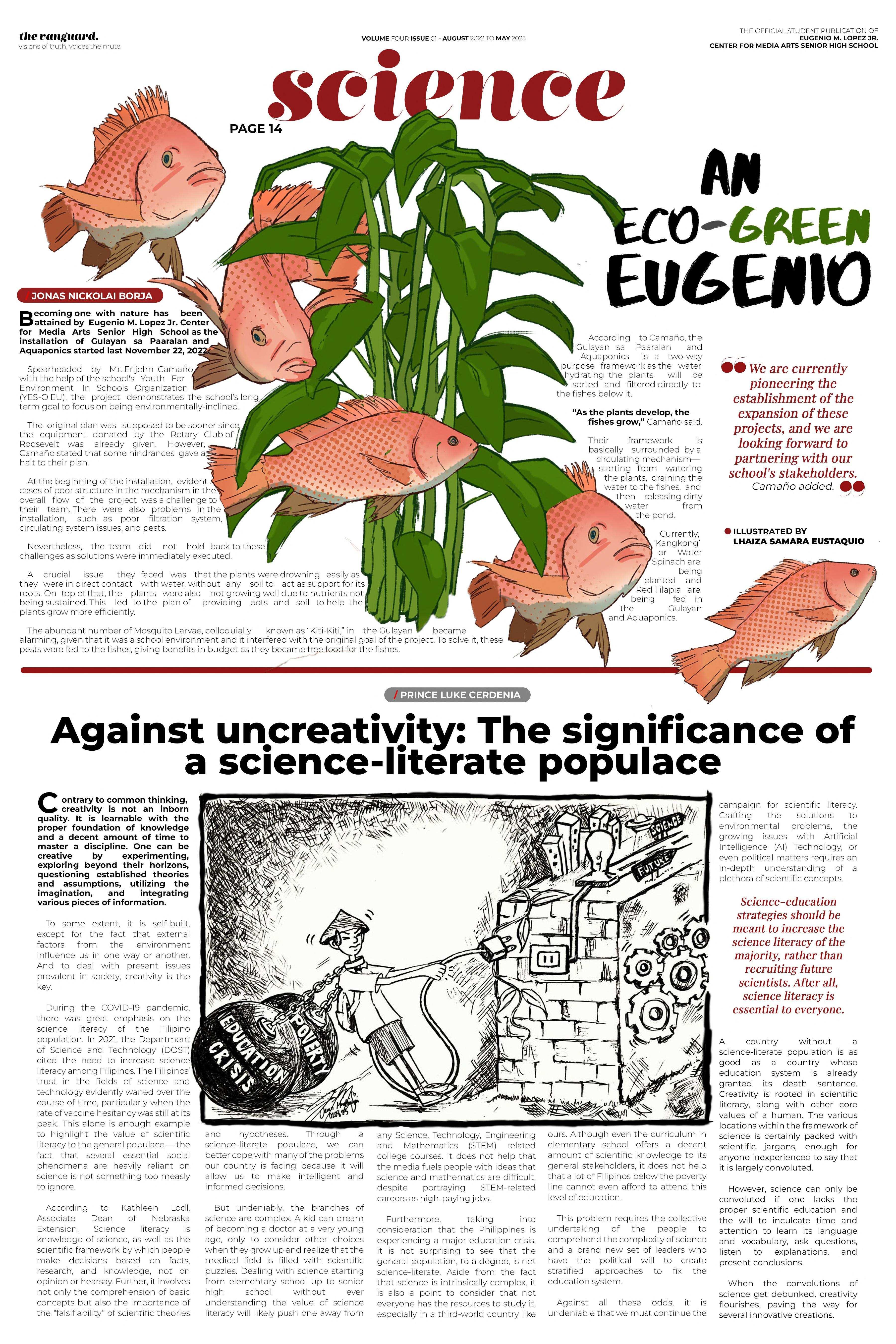 The VANGUARD is the official English student publication of Eugenio M. Lopez Jr. Center for Media Arts Senior High School. This edition went on to win Best Layout and 3rd Best News Page in the NCR Regional School Paper Contest, securing a ticket to the National Schools Press Conference 2023.
