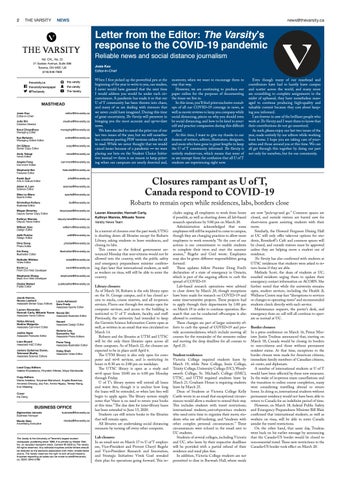 Letter from the Editor: The Varsity’s response to the COVID-19 pandemic Vol. CXL, No. 22 21 Sussex Avenue, Suite 306 Toronto, ON M5S 1J6 (416) 946-7600 thevarsity.ca