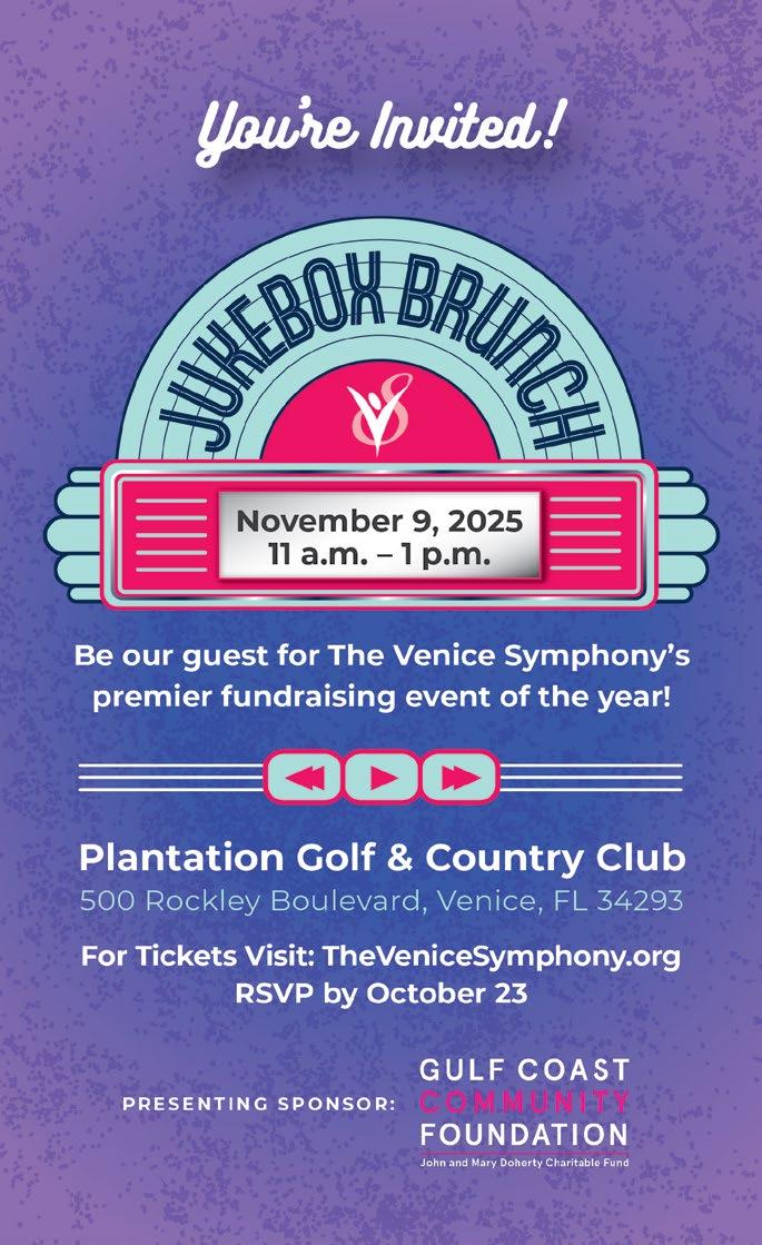 On November 9th, we invite you to “jukebox and jive” at our premier fundraiser for the 2025-26 Season…Jukebox Brunch at Plantation Golf & Country Club. Travel back in time to the sock hop era where you can hear (and even request!) classic tunes from Venice Big Band musicians and raise funds to support The Symphony’s mission. Sunday best encouraged.