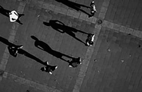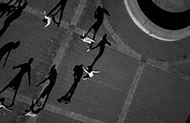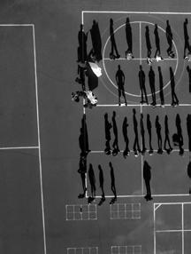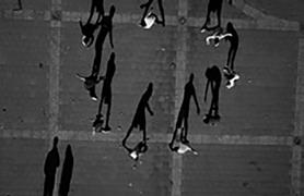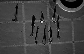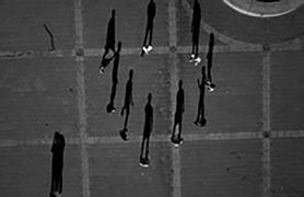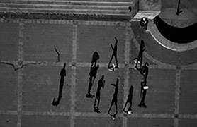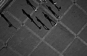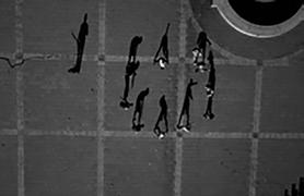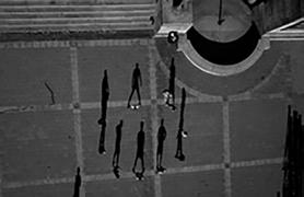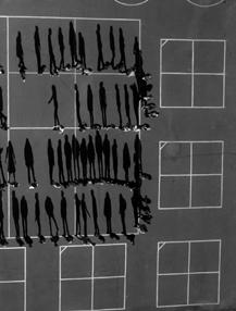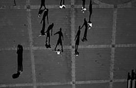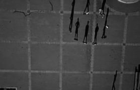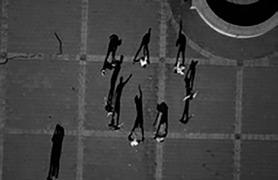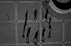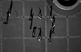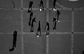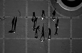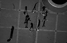 when seen vertically on a wall — or a computer screen — rather than horizontally on a page, from above. Viewed like this, the shadows take on a life of their own, acquire again the human qualities lost to the barely visible “counters.” The problem is that these shadow gestures are difficult to read or interpret with any accuracy. Playing looks like fighting. Clowning around becomes aggressive — and mistakes have consequences. Being shot by a camera becomes a prelude to being shot for real.