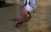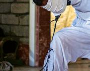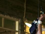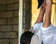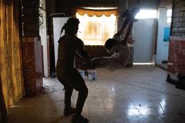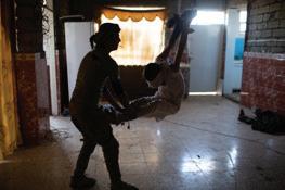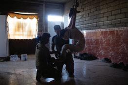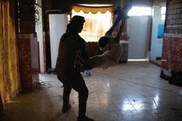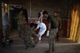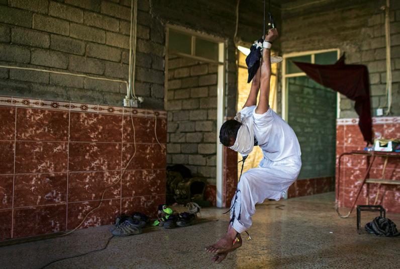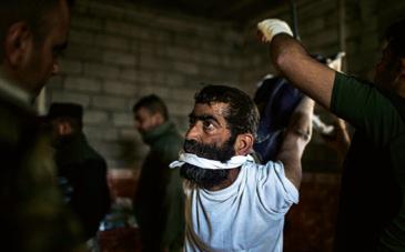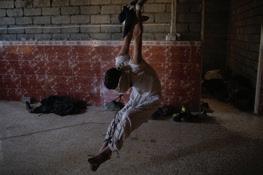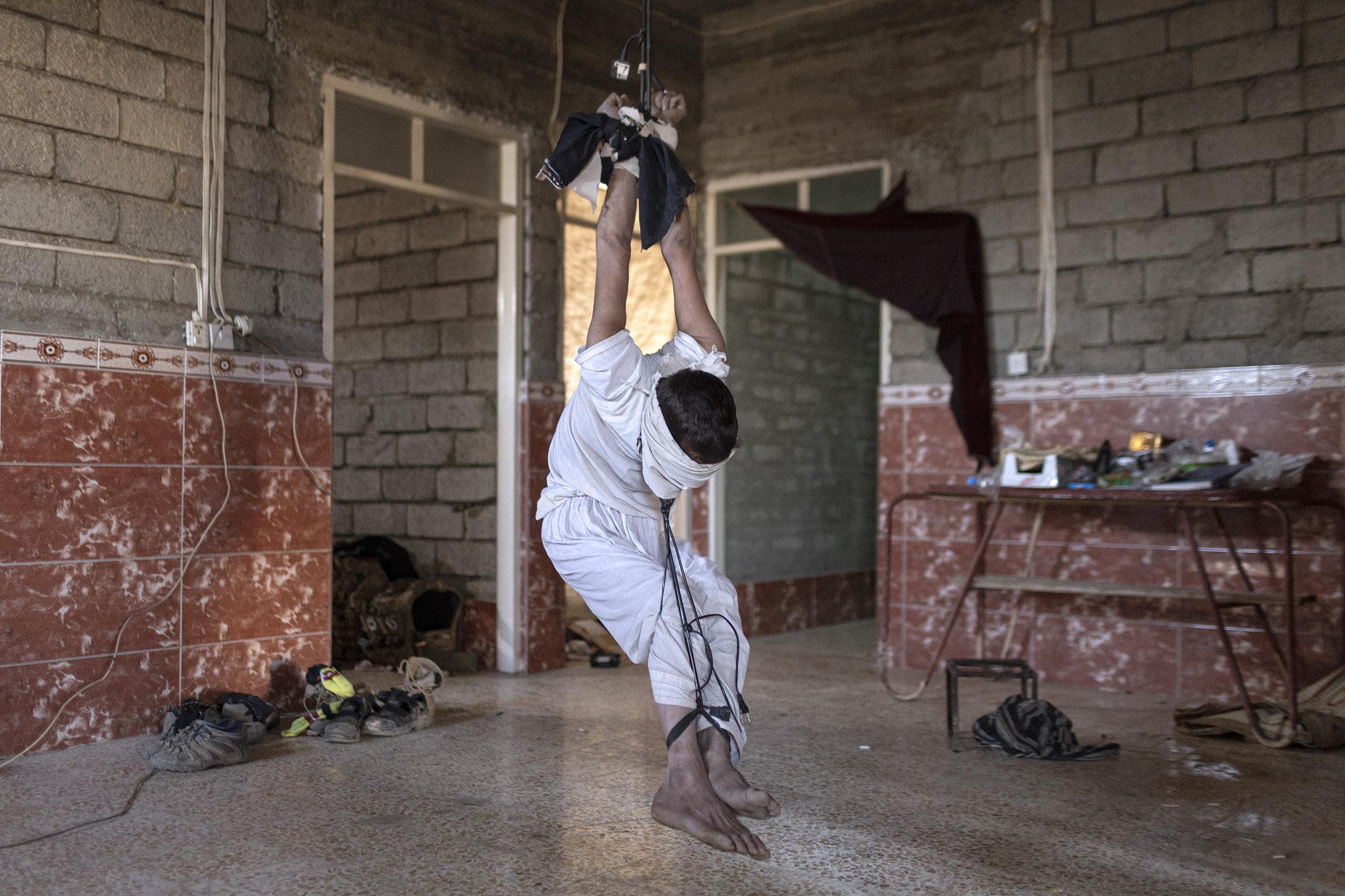 Mahdi Mahmud is hung by rope from the roof of the hallway by the Iraqi Reconnaissance Unit as part of his torture and interrogation. Mahdi Mahmoud was displaced from Mosul with his family to his village. He and his 16-year-old son Ahmad were arrested upon arrival. They were tortured for more than an hour and later released. Two weeks later, Ali Arkady was told that the Intelligence Regiment arrested Ahmad Mahdi and executed him with a group of detainees near Qabr al-Abd village, Hammam al-Alil, South Mosul. Iraq, November 23, 2016.